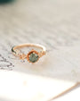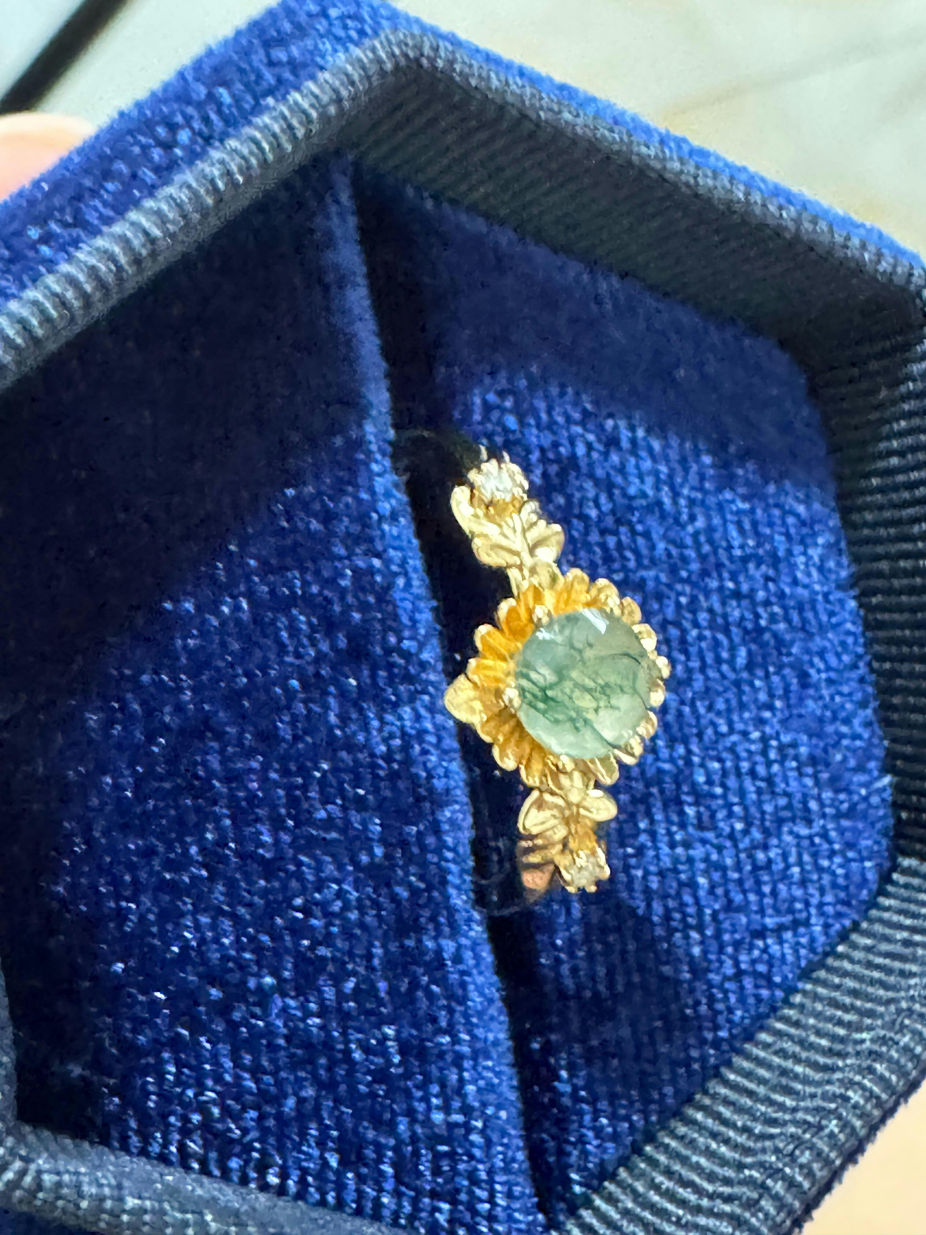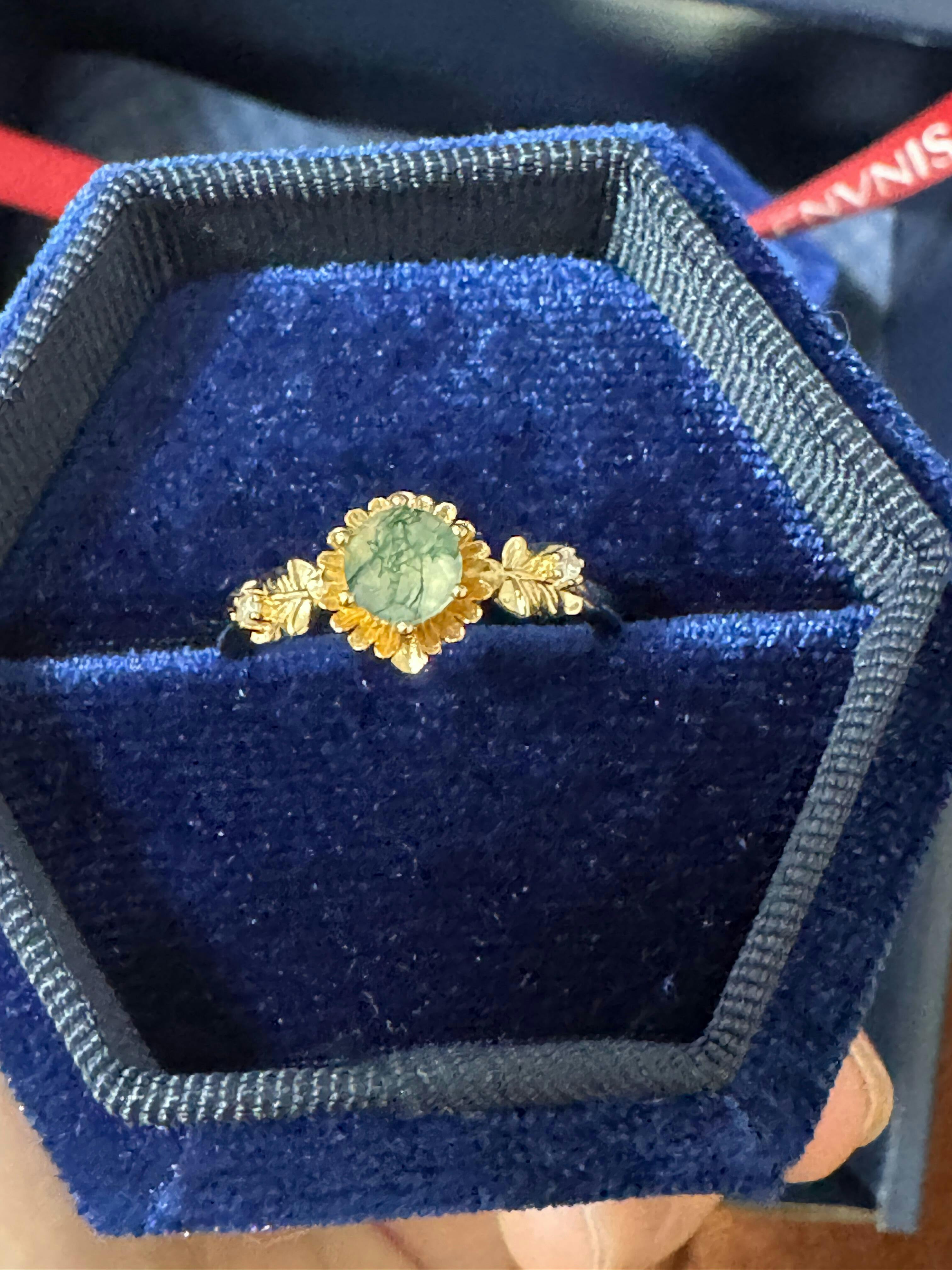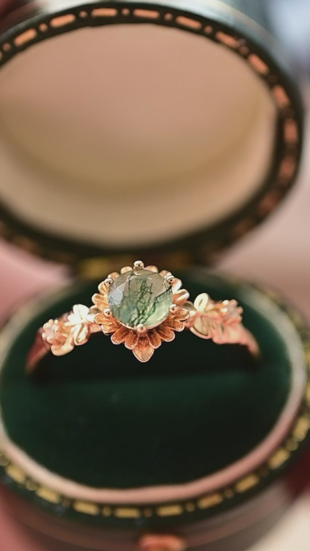 Inspiriert vom warmen Glanz sommerlicher Felder feiert der Sunflower Bloom Moosachat-Ring die Lebendigkeit des Sonnenlichts und das stille Wachstum der Natur. Der runde, facettierte Moosachat in der Mitte erinnert an winzige verborgene Wälder, während der sonnenblumenförmige Halo die freudige Energie einer sonnenbeschienenen Blüte einfängt. Zarte Blattakzente auf jeder Seite vervollständigen die Geschichte von Leben und Erneuerung und machen diesen Ring zu einem Symbol für Optimismus und natürliche Schönheit.