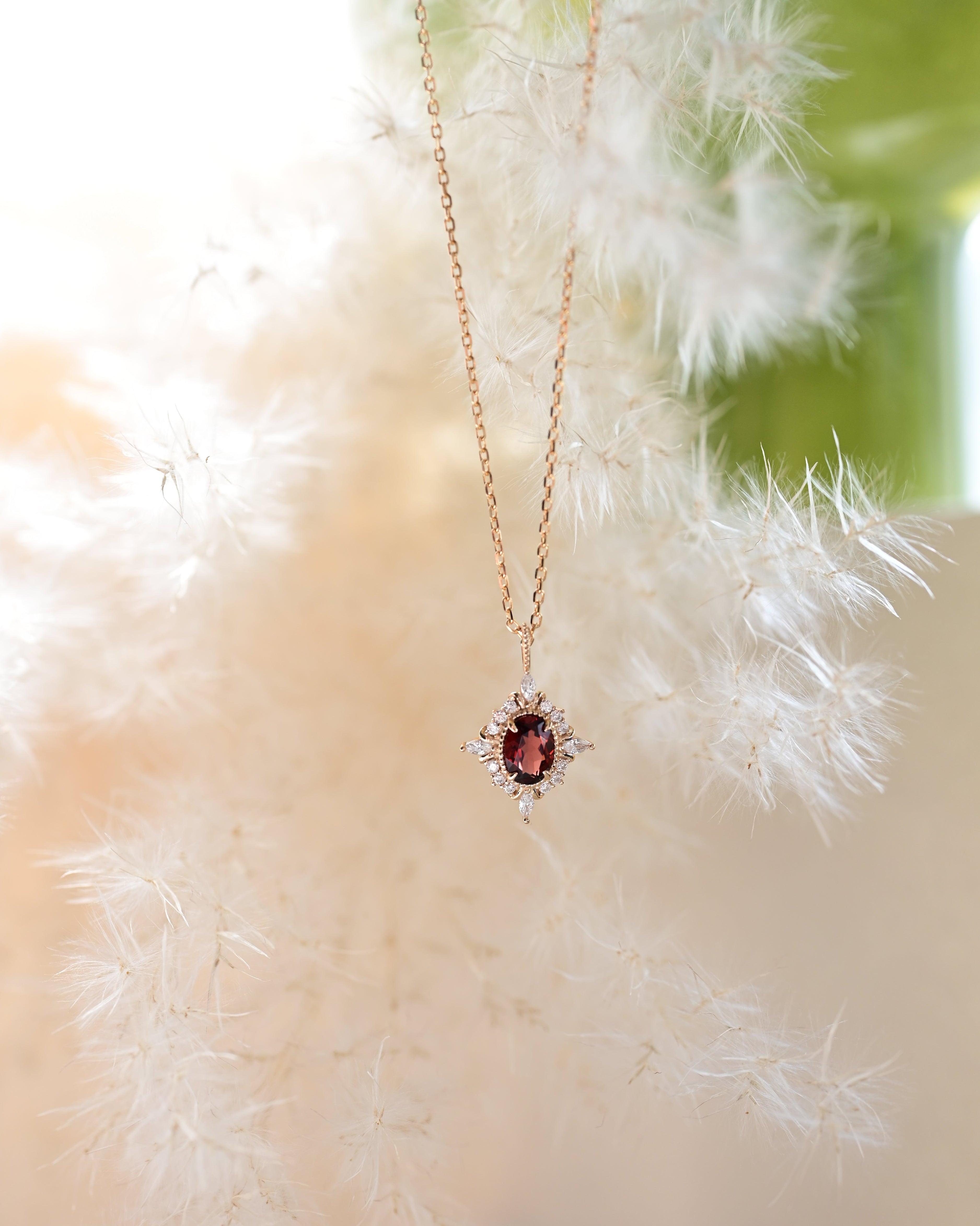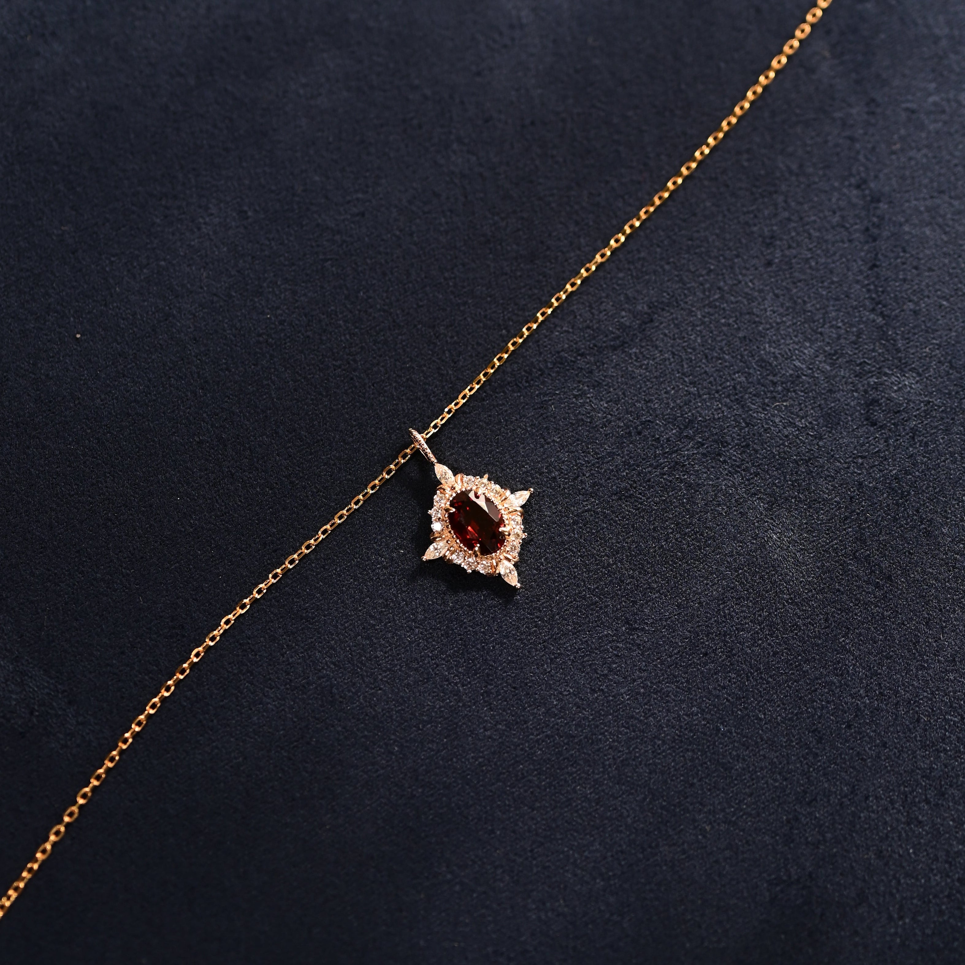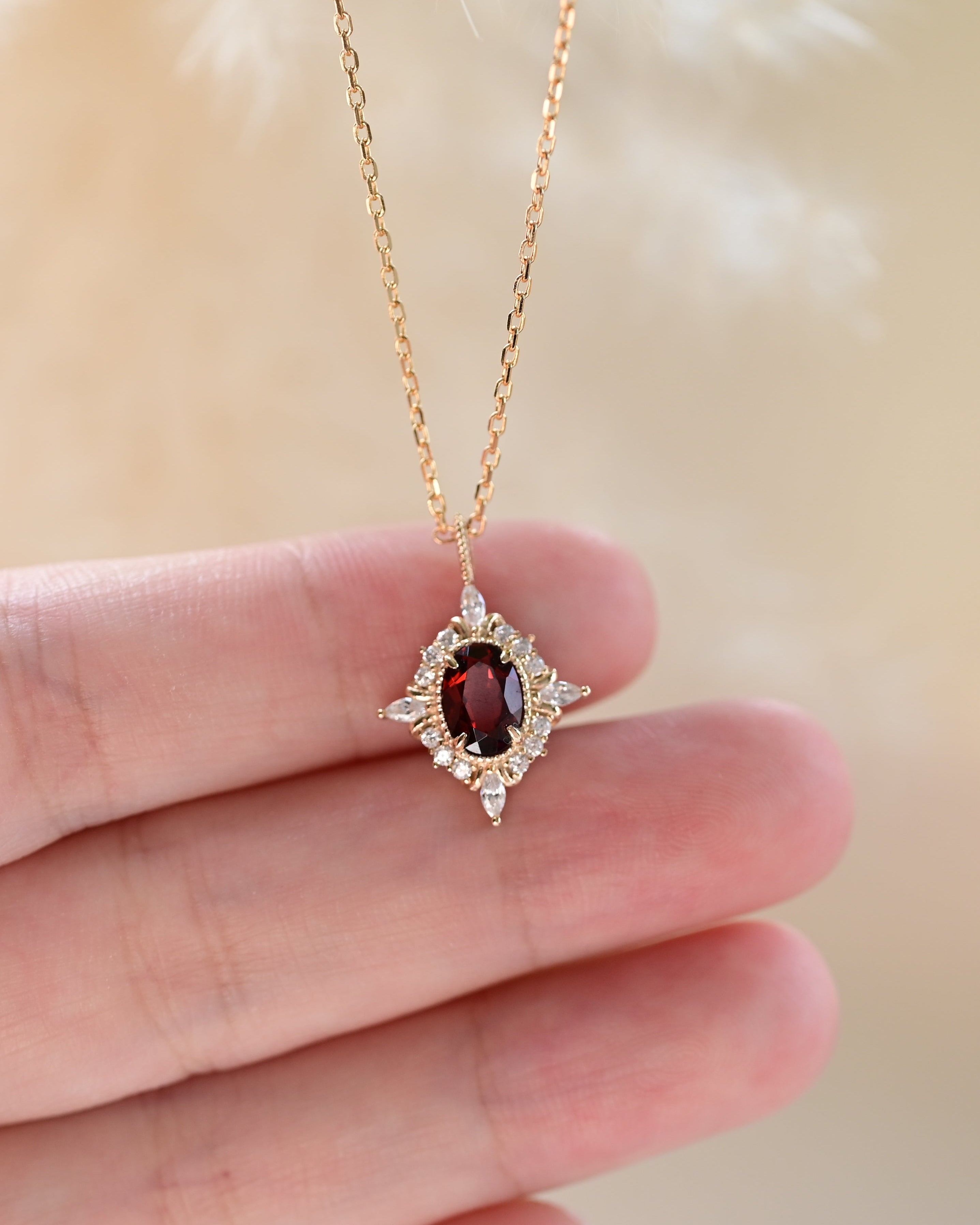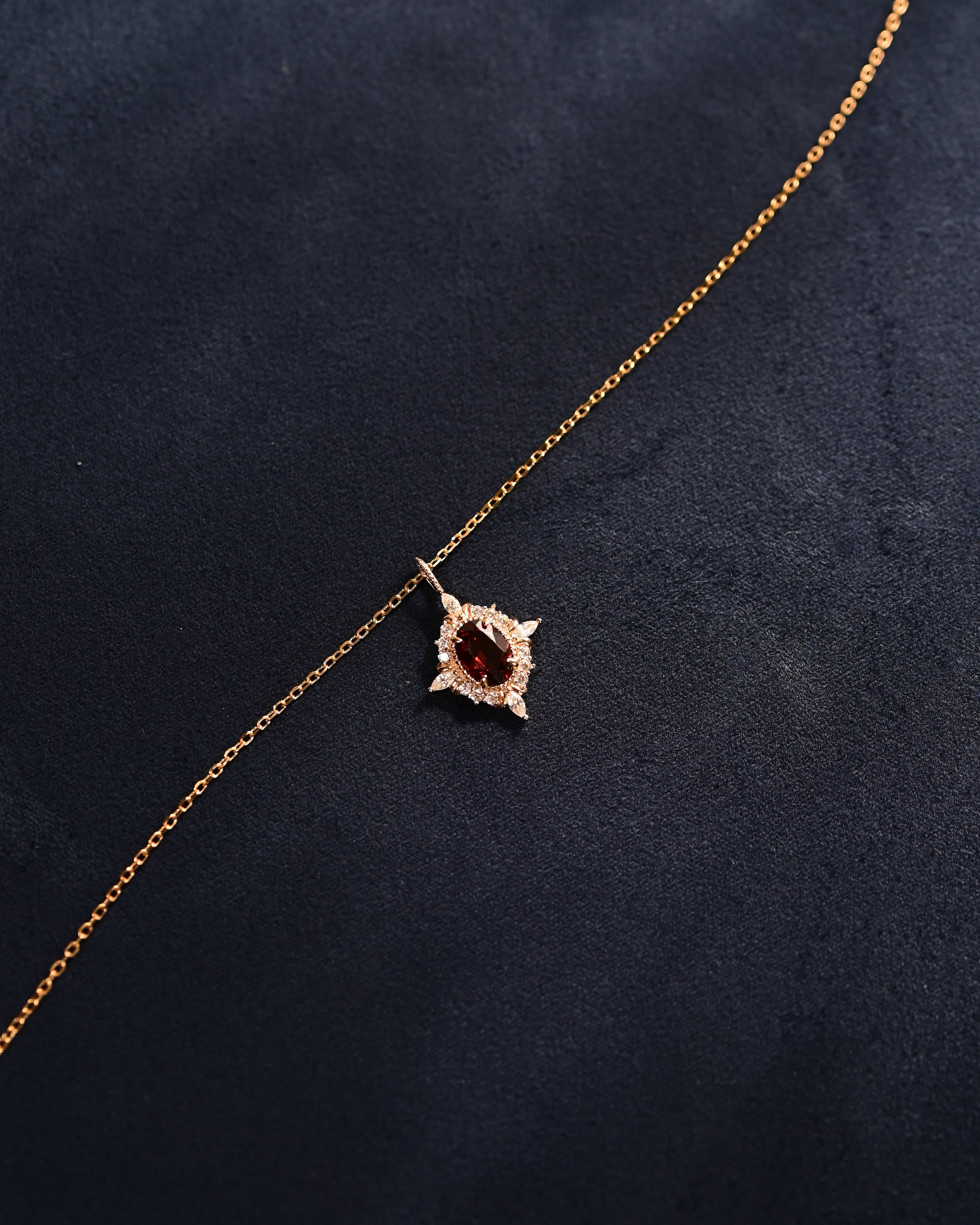 Inspiriert von der zeitlosen Eleganz antiker Erbstücke und dem leidenschaftlichen Glühen tiefroter Farbe feiert die Crimson Halo Granat-Halskette Liebe und beständige Schönheit. Ihr reicher Granat in der Mitte strahlt Wärme und Stärke aus, während der umliegende Heiligenschein aus funkelnden Steinen eine kronenähnliche Brillanz erzeugt. Entworfen, um Romantik und königlichen Charme hervorzurufen, spricht dieses Stück von Hingabe, Selbstvertrauen und der Kraft einer Liebe, die niemals verblasst.