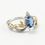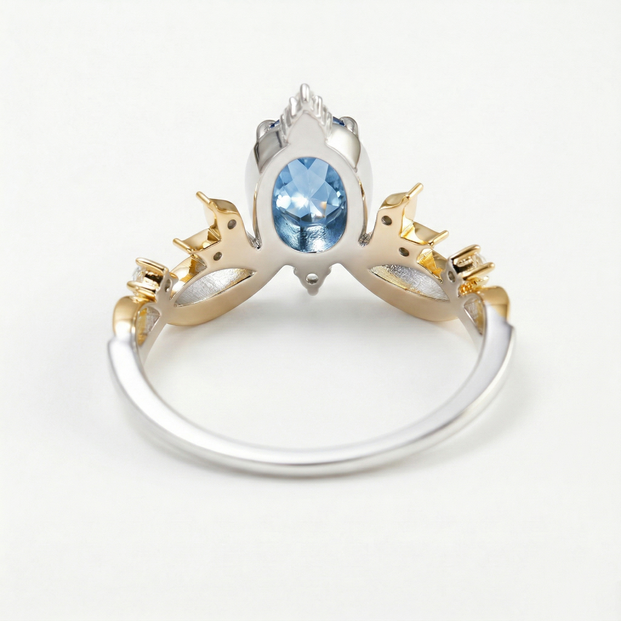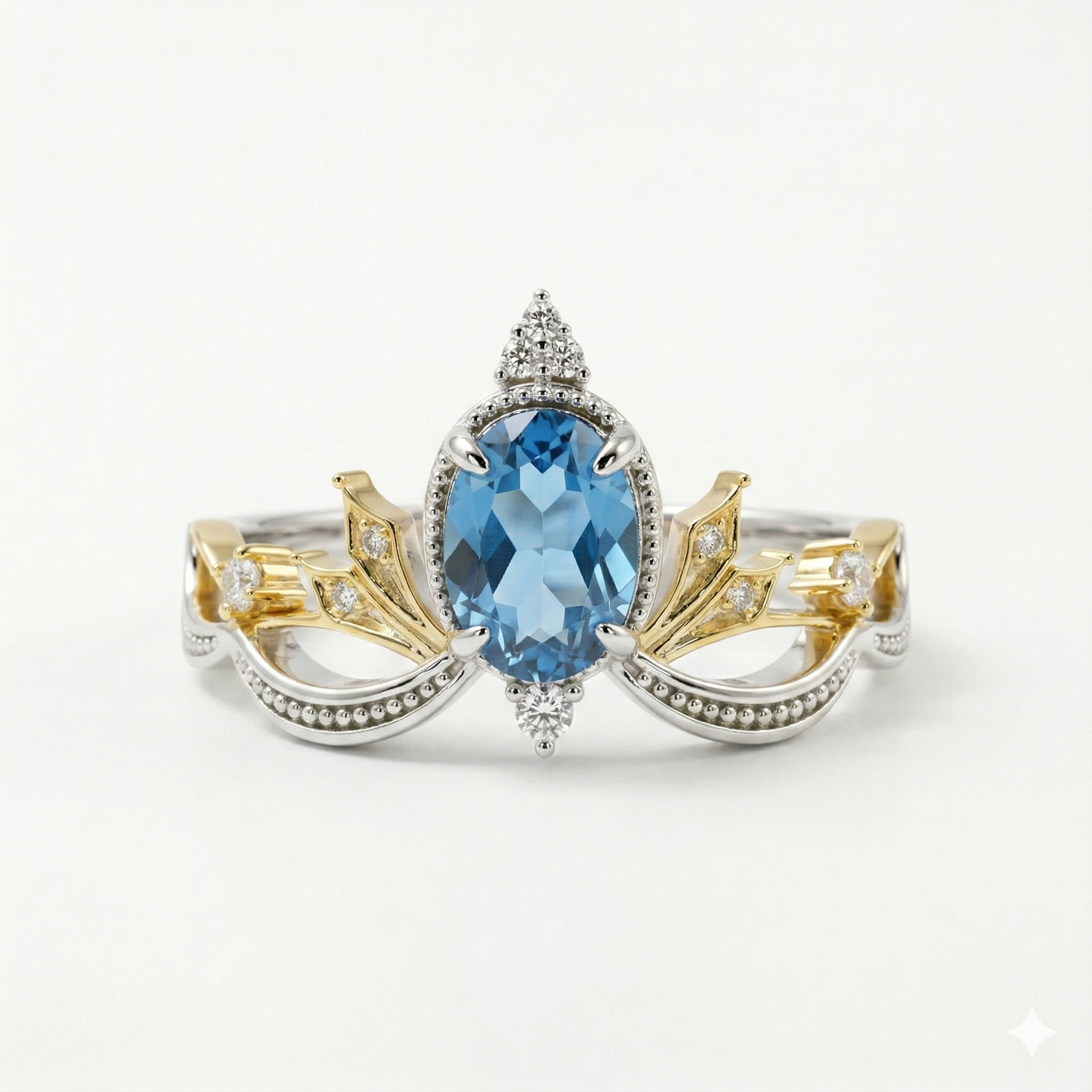 Inspirado en el cielo nocturno coronado con estrellas brillantes, el Anillo Celestial Corona con Topacio Azul Londres captura la serena profundidad del crepúsculo. El topacio ovalado de corte brillante refleja la luz como ondas de luz estelar sobre aguas tranquilas, enmarcado por detalles elegantes en forma de corona que simbolizan la elegancia, la fuerza y la serenidad interior.