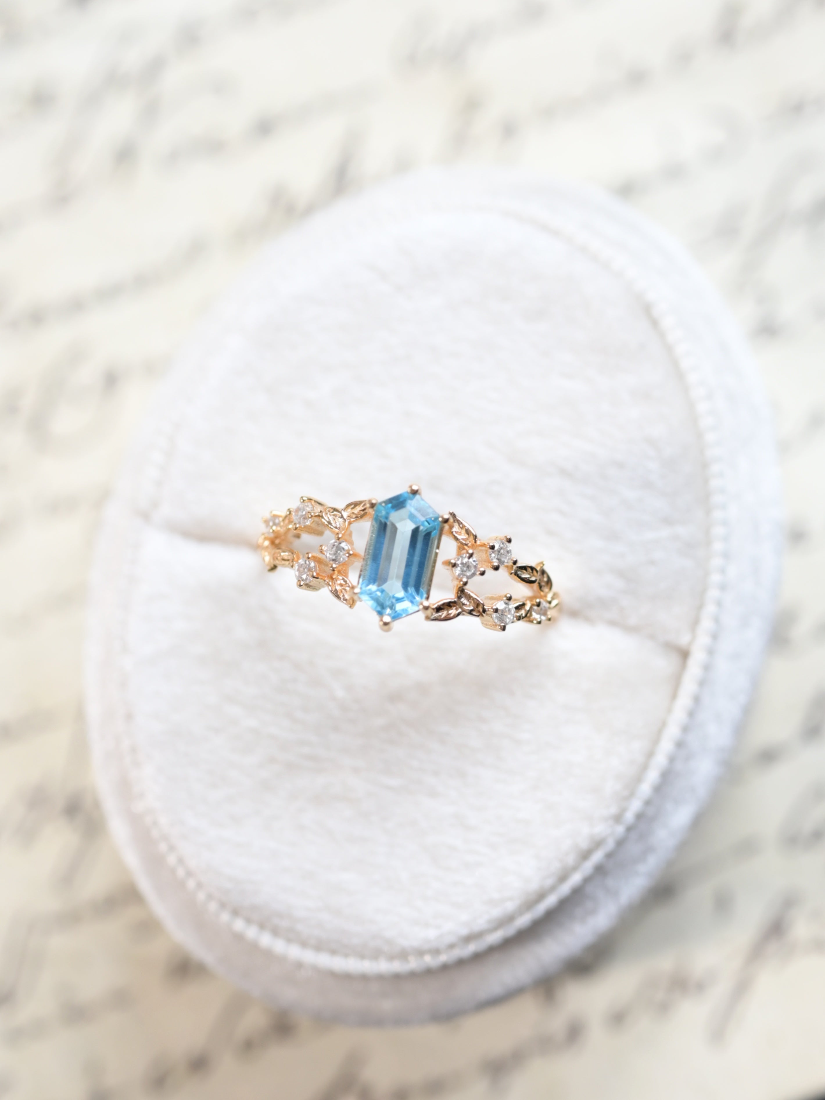 Anillo de hoja con topacio azul Londres talla esmeralda