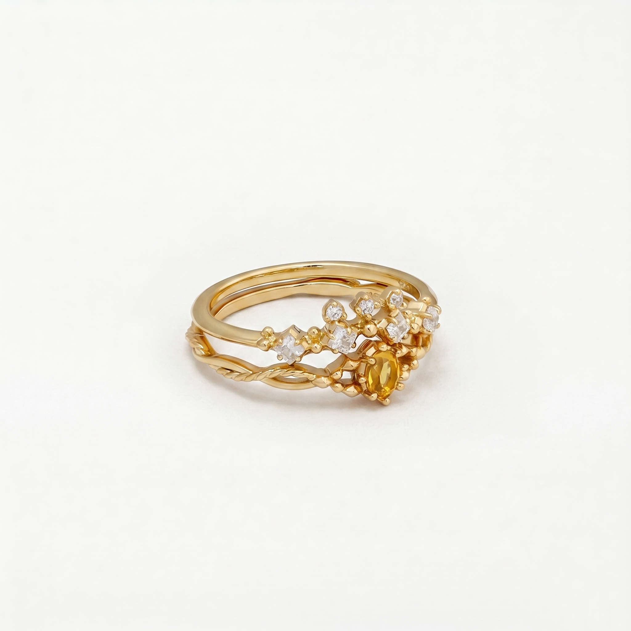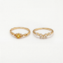Inspirado en coronas reales y el resplandor dorado del amanecer, este conjunto de anillos presenta un citrino en corte pera como su radiante pieza central. El diseño escalonado evoca la tiara de una reina, simbolizando confianza, claridad y luz interior.