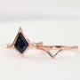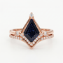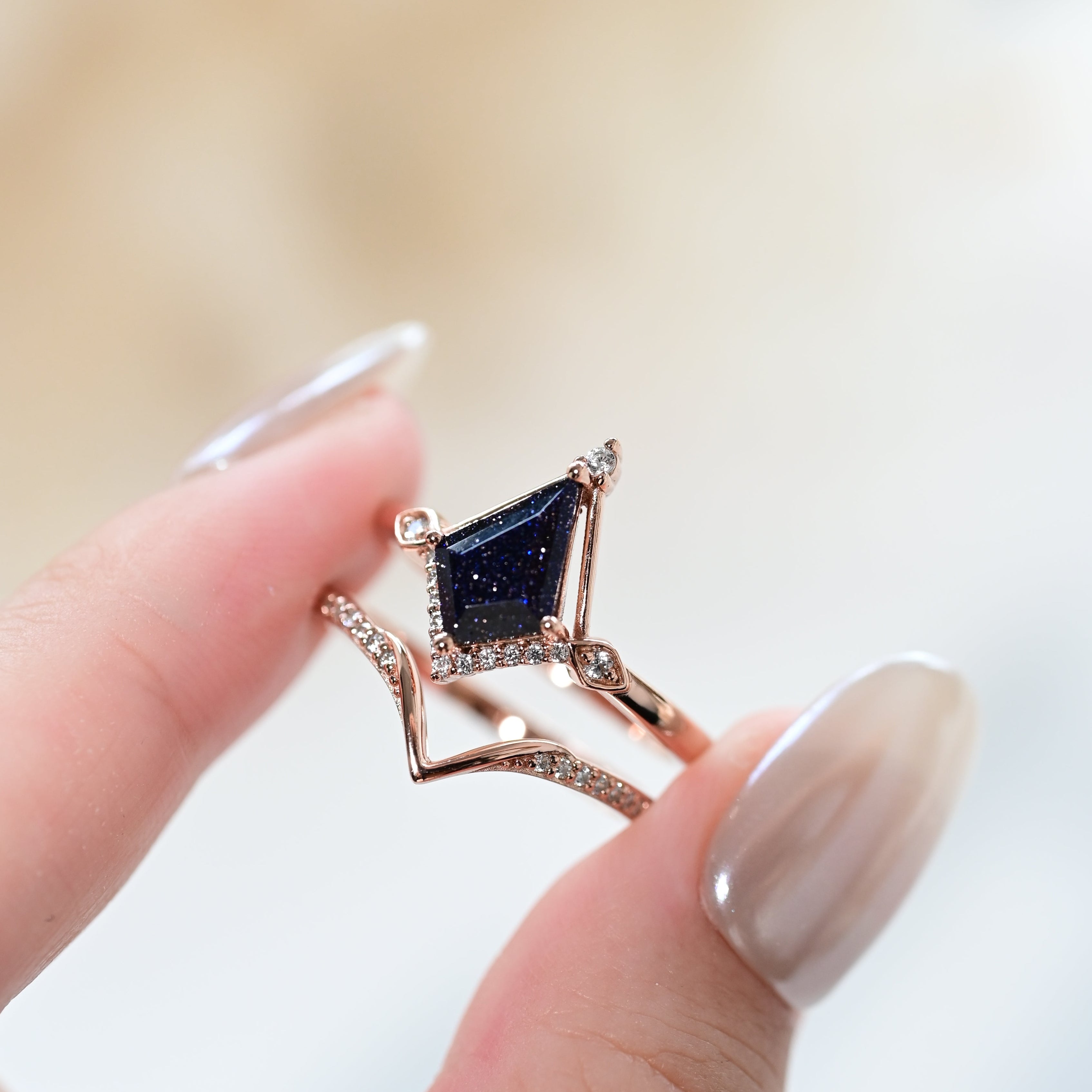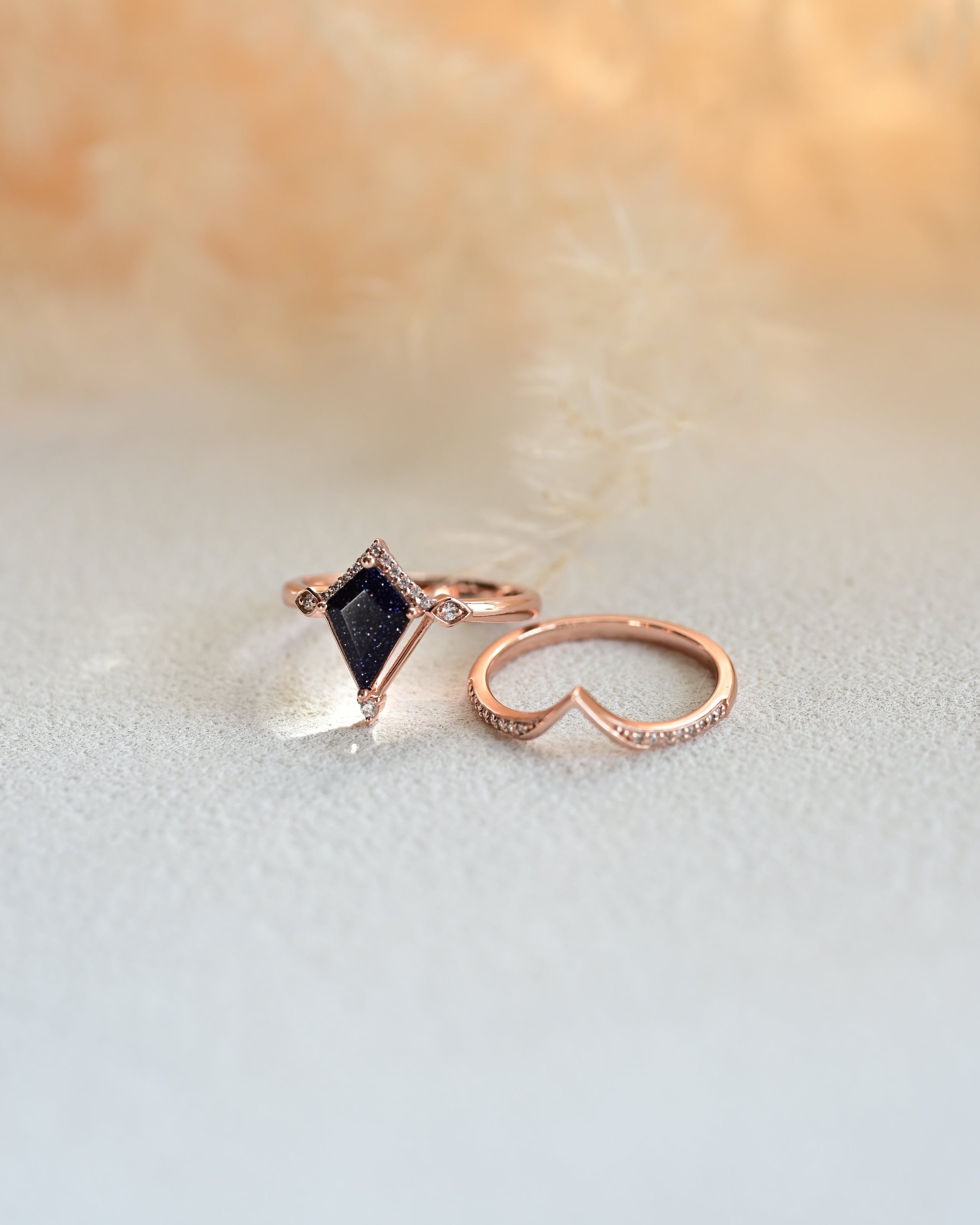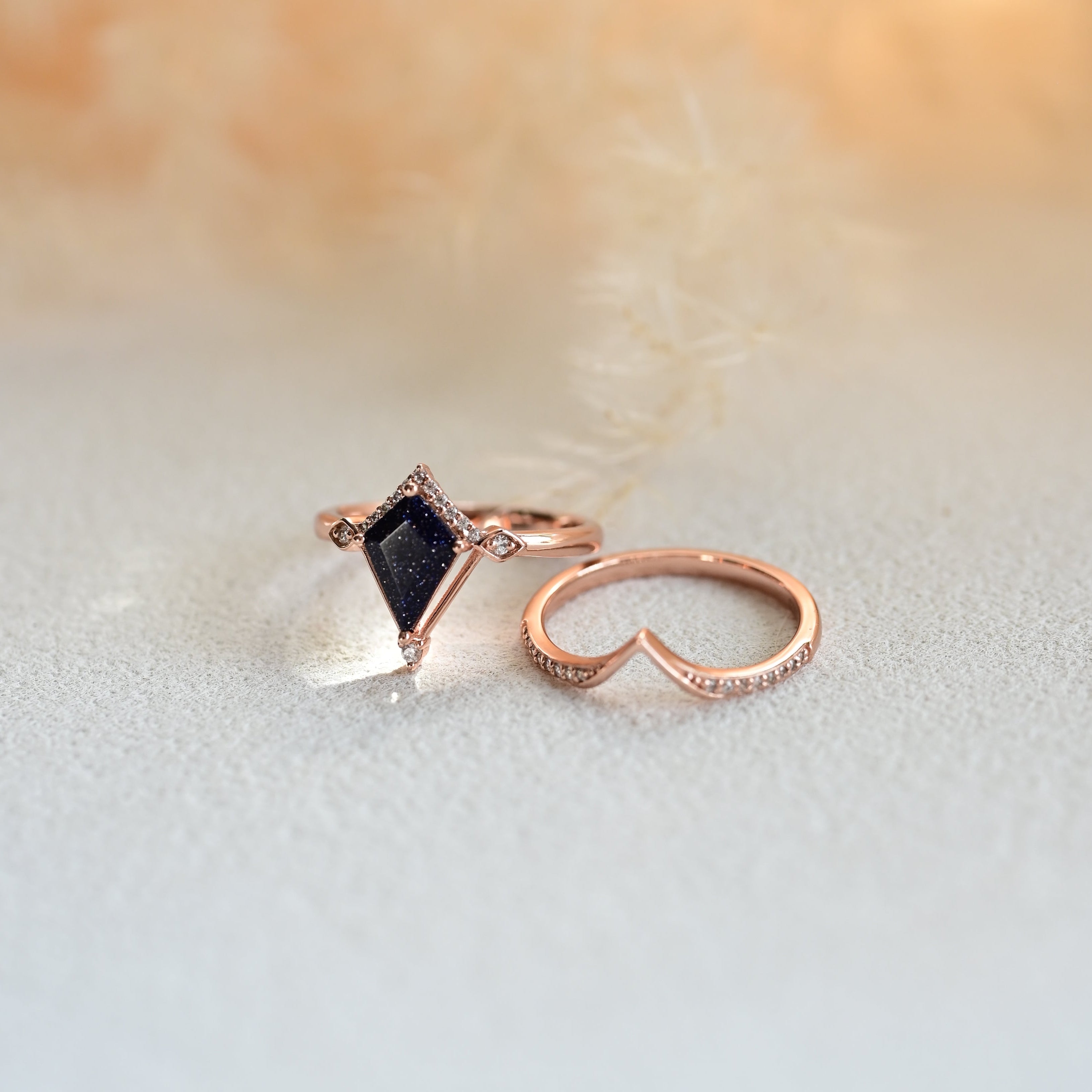 Inspirado en el misterio y la maravilla de los cielos estrellados, el Conjunto de Anillos Apilables Kite Cut Blue Goldstone captura la belleza de la noche infinita. La llamativa piedra con corte cometa refleja una galaxia de estrellas brillantes, mientras que la banda en forma de V simboliza dirección y aspiración. Juntos, encarnan el coraje, los sueños y el brillo de seguir el propio camino.