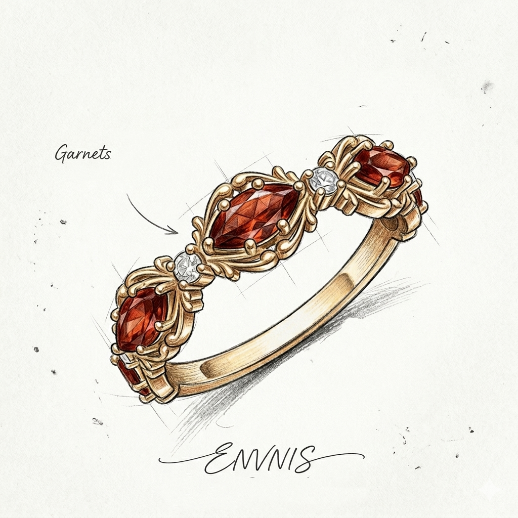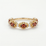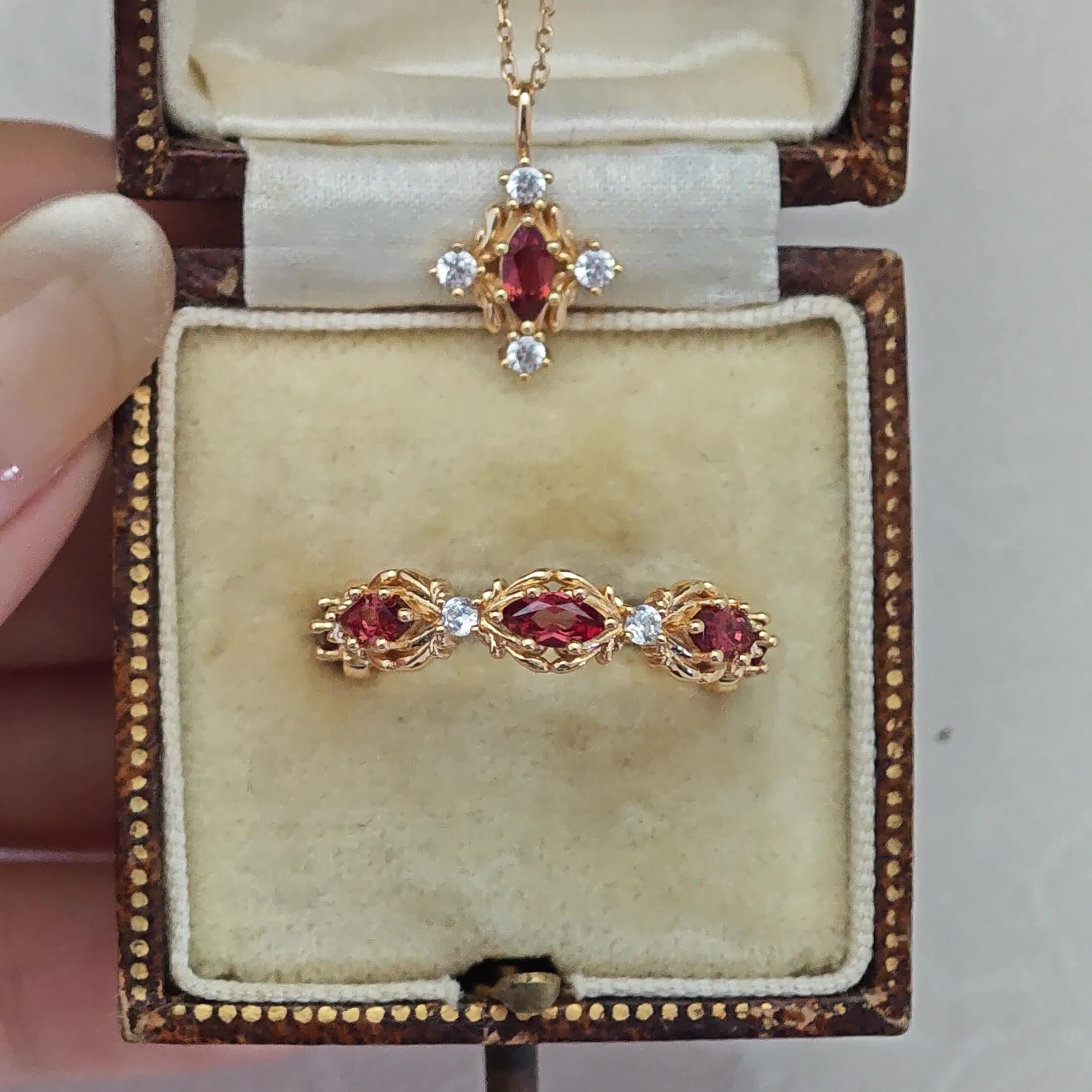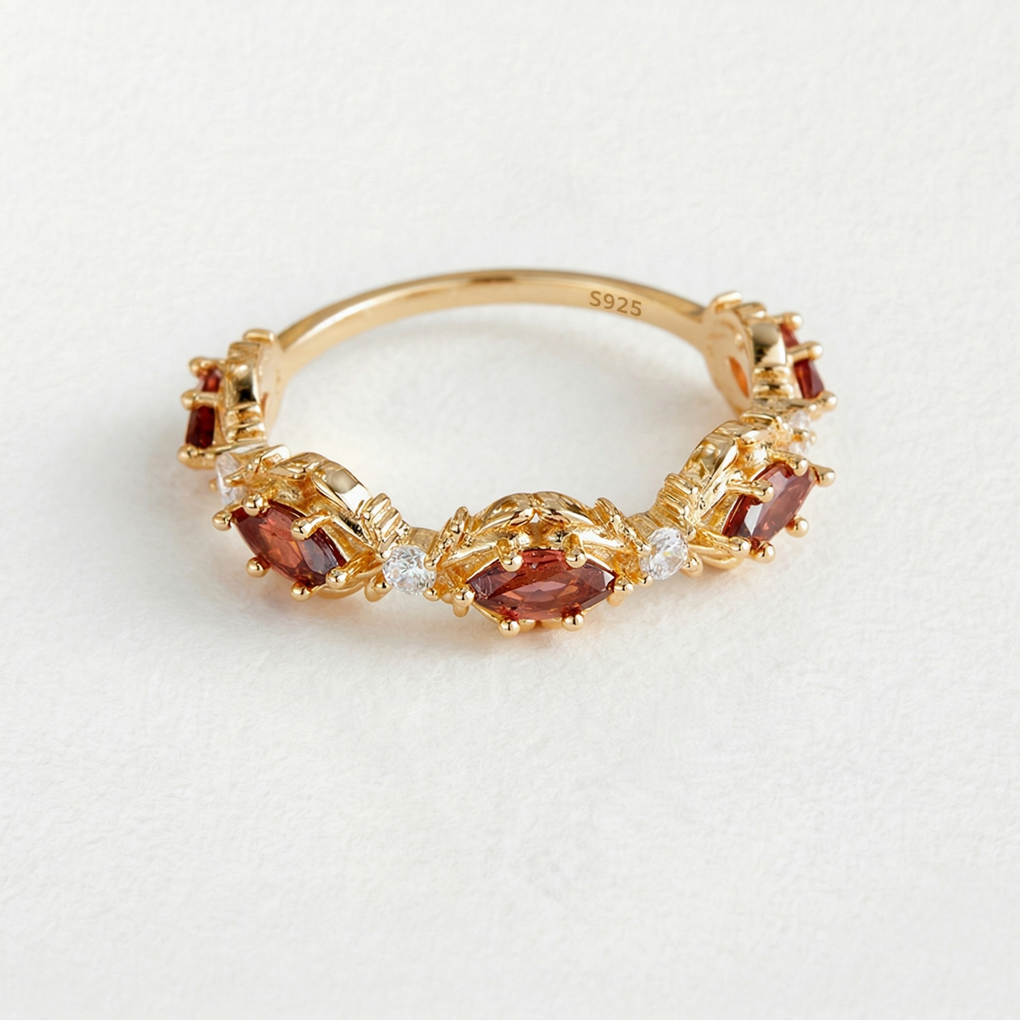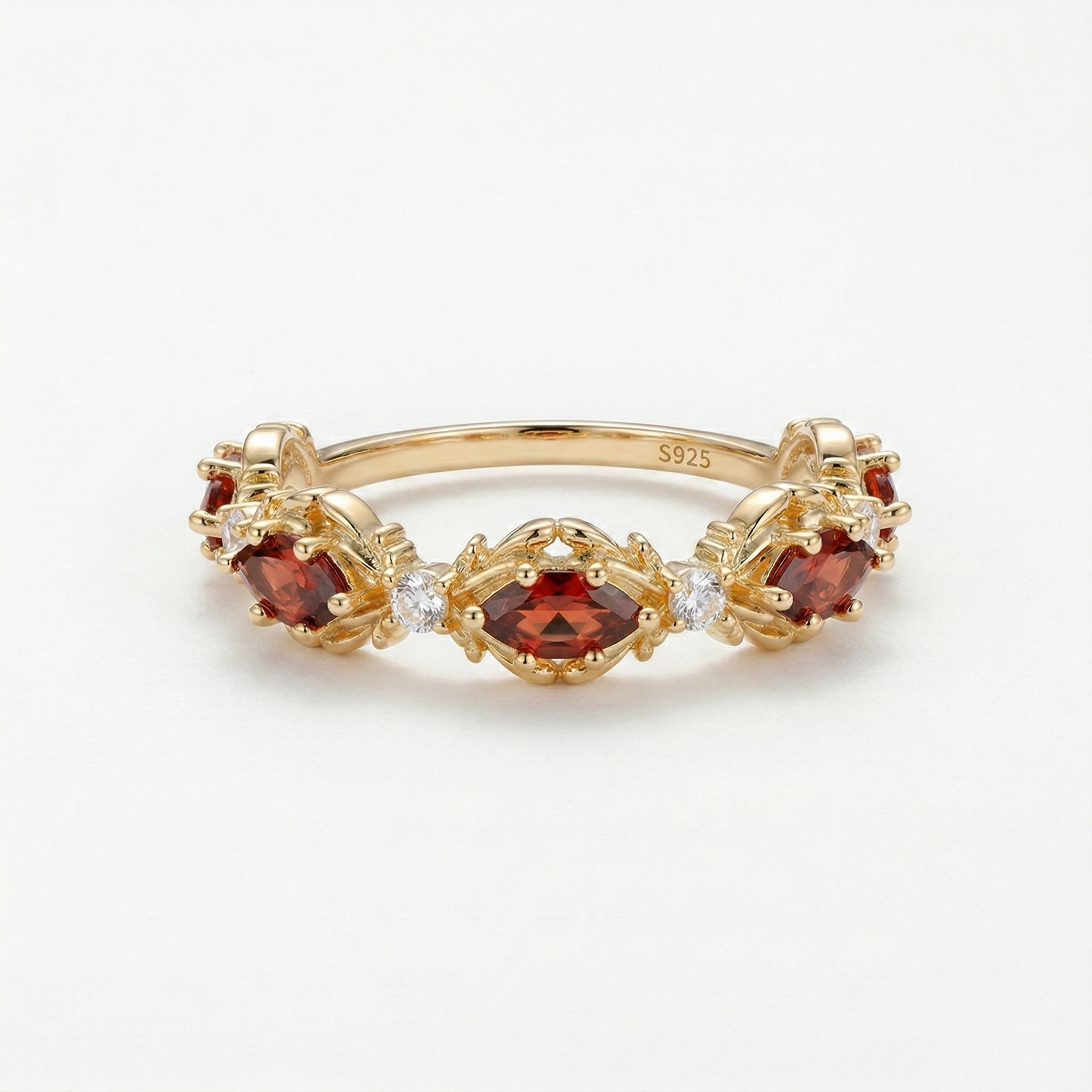 Inspired by vintage heirloom jewelry, the Marquise-Cut Garnet Band Ring showcases elongated marquise-shaped stones arranged in a graceful, symmetrical rhythm. The eye-shaped silhouettes create a sense of flow and balance, while the warm crimson glow adds depth and quiet intensity. Designed to feel timeless yet expressive, this ring reflects enduring elegance and confident femininity.