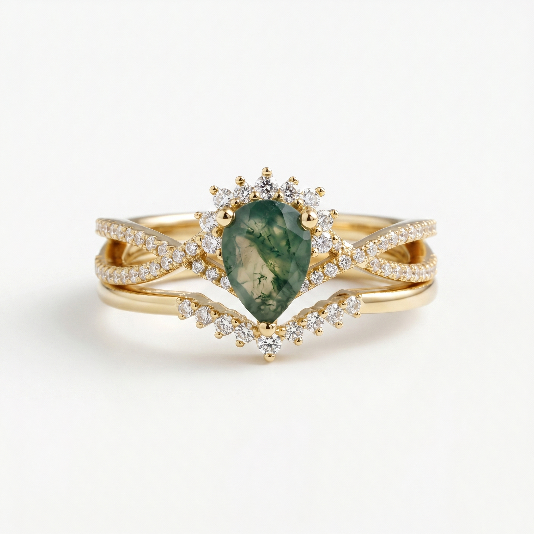 Nacido de la quietud de antiguos bosques, este conjunto de anillos de ágata musgosa captura la poesía silenciosa de la naturaleza. Cada piedra en forma de lágrima contiene un paisaje en miniatura — como la niebla matutina descansando sobre las hojas, o las sombras danzando bajo altos pinos. Un tributo a lo salvaje, lo tranquilo y lo bellamente irrepetible.
