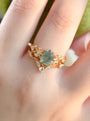 Inspirado en el cálido resplandor de los campos de verano, el Anillo de Ágata Musgosa con Flor de Girasol celebra la vitalidad de la luz solar y el crecimiento silencioso de la naturaleza. La ágata musgosa redonda y facetada en el centro evoca pequeños bosques ocultos, mientras que el halo en forma de girasol captura la energía alegre de una flor iluminada por el sol. Delicados acentos de hojas a cada lado completan la historia de la vida y la renovación, haciendo de este anillo un símbolo de optimismo y belleza natural.