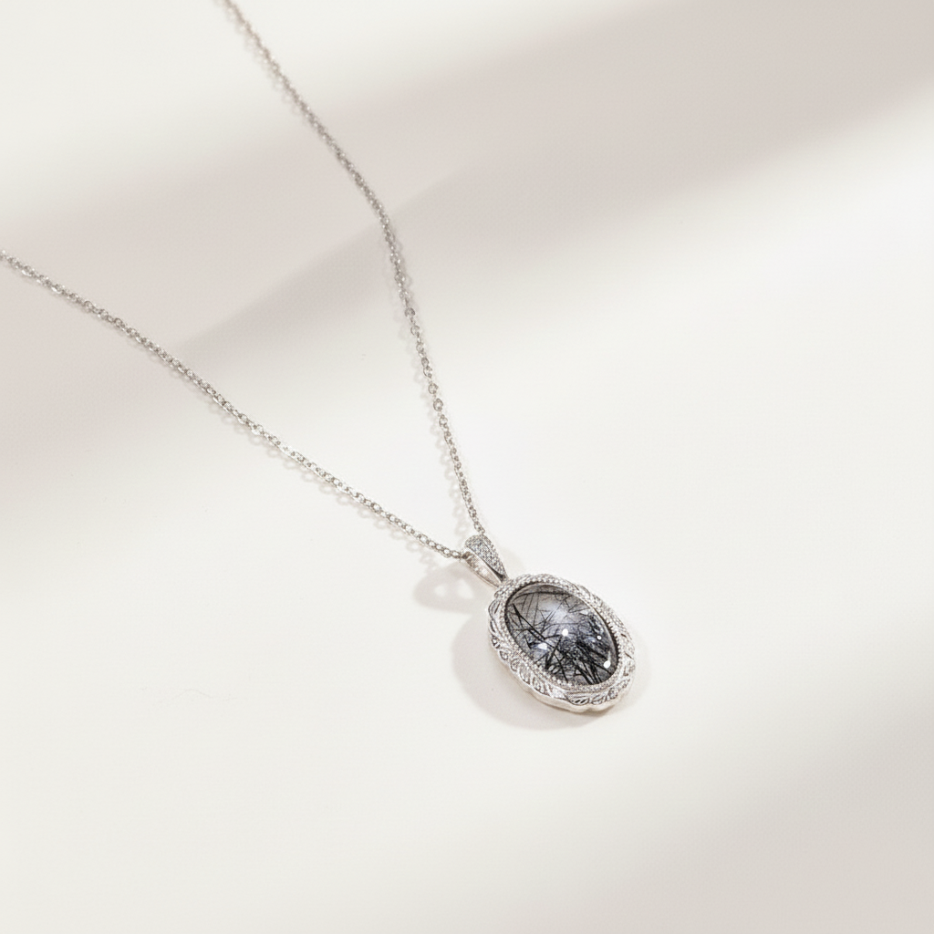 Le pendentif ovale vintage en quartz rutile puise son inspiration dans les cadres de portraits anciens et la beauté discrète des inclusions naturelles. Le quartz rutile ovale allongé est enfermé dans un cadre finement détaillé, capturant le contraste entre le minimalisme moderne et l’artisanat d’antan. Chaque motif de rutile noir est totalement unique — comme des traits d’encre suspendus dans le cristal — faisant de ce pendentif une pièce d’art à porter.