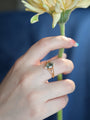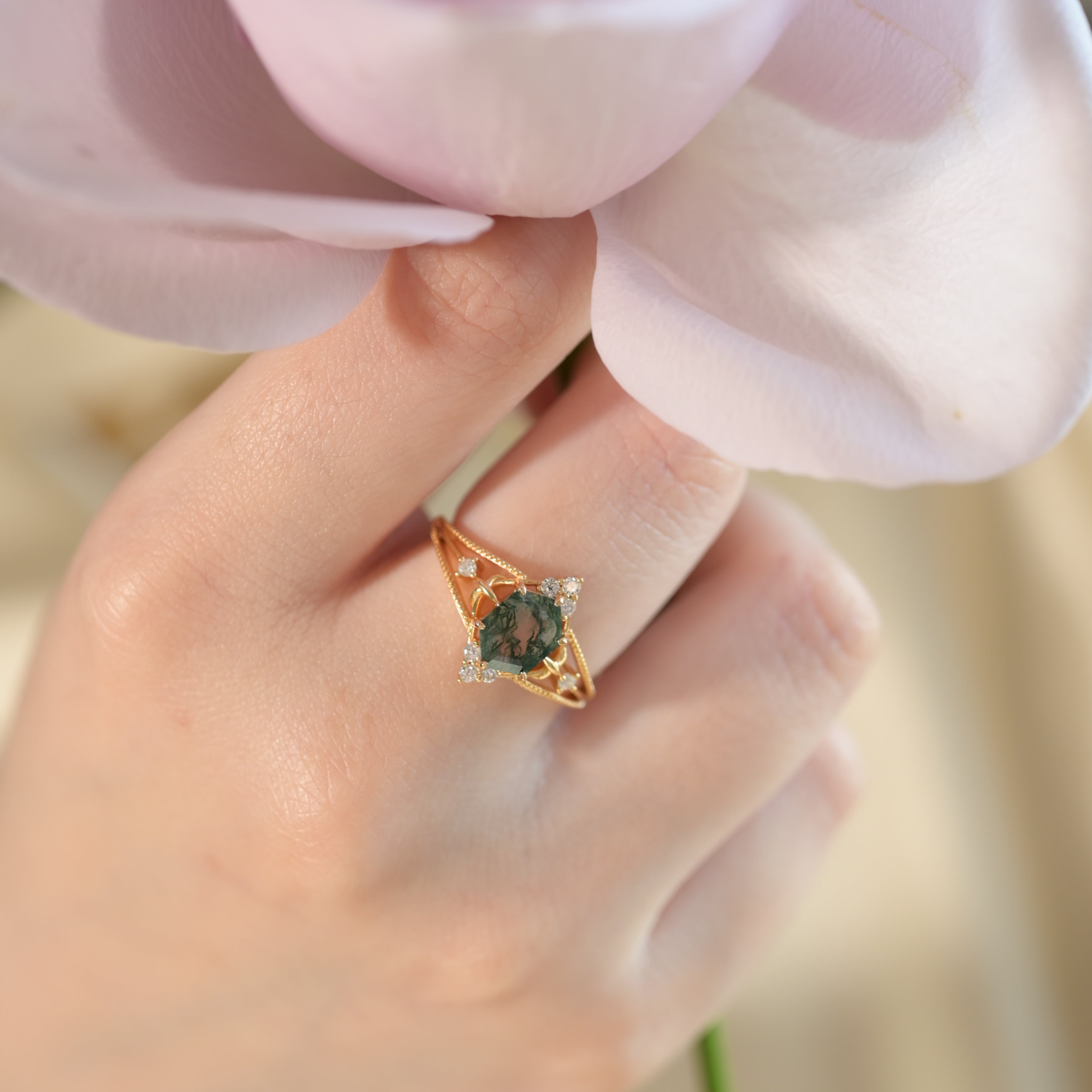 Ispirato alla serenità e al mistero di un bosco nascosto, questo anello incarna la poesia silenziosa della natura. Al suo centro si trova un cabochon di agata muschiata, le sue intricate inclusioni verdi ricordano le sagome di una foresta, circondate da un reticolo dorato di viti e pietre scintillanti. Insieme catturano la radiosità della luce solare che filtra attraverso alberi antichi — un tributo senza tempo alla pace interiore e all’eleganza radicata.