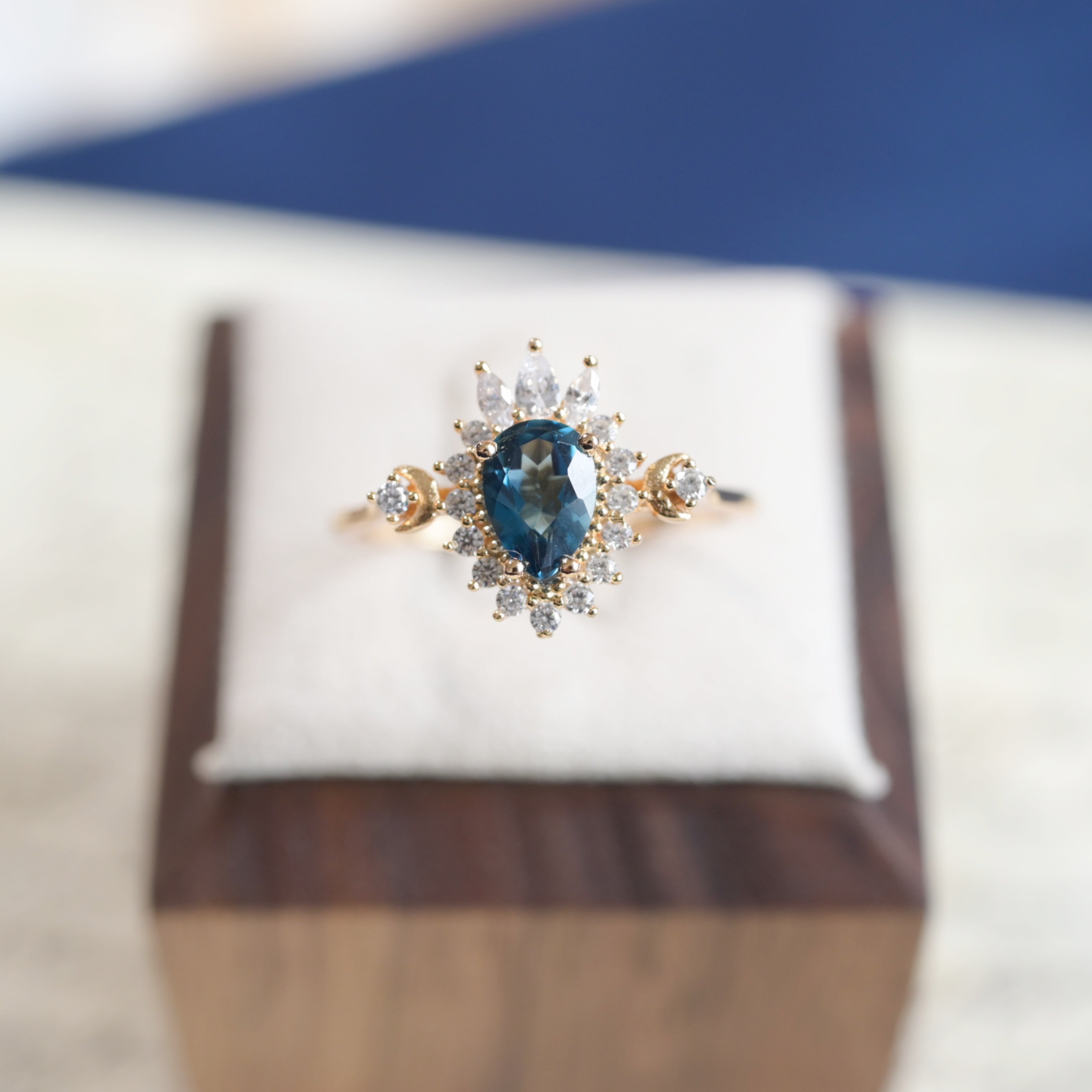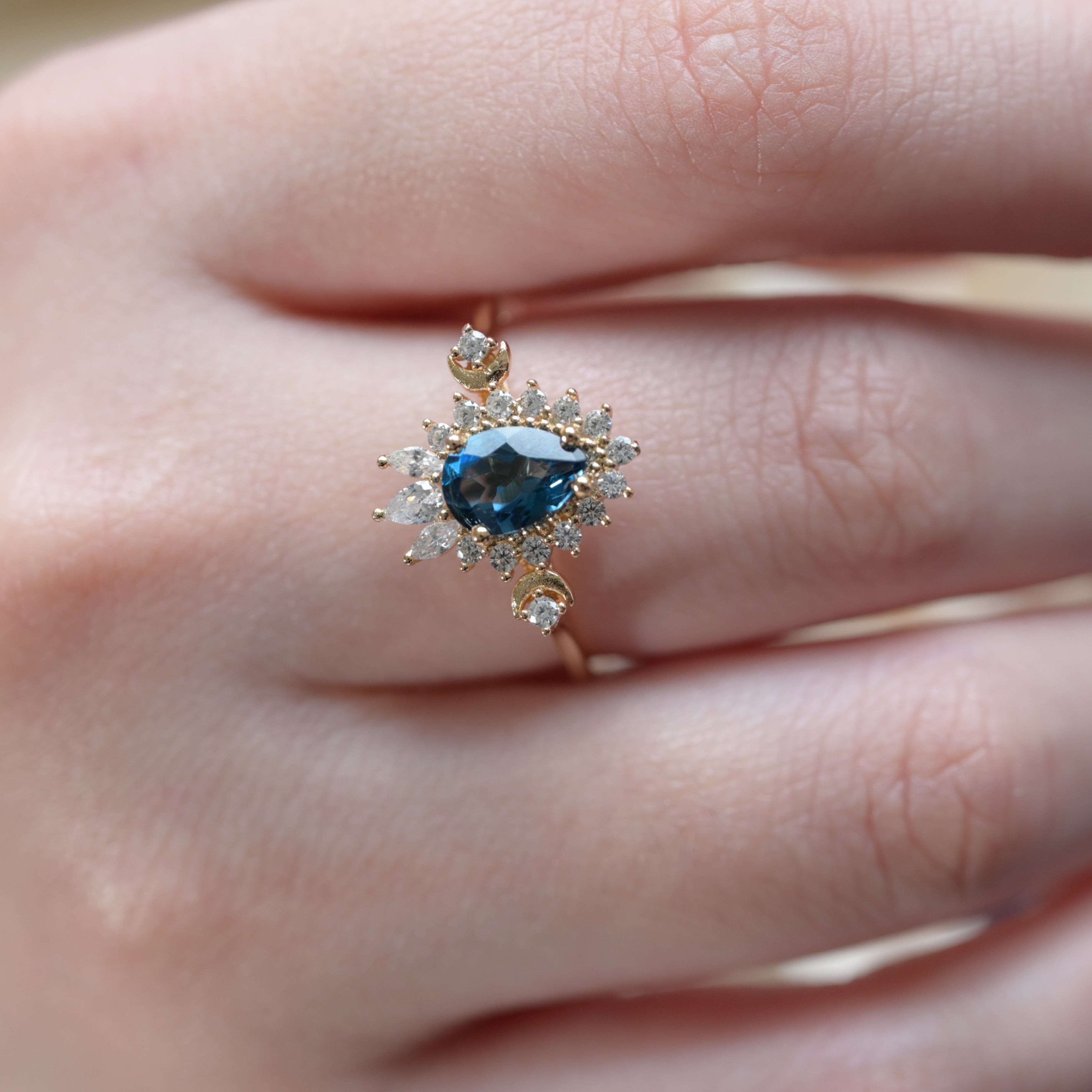 Ispirato al mistero silenzioso degli aloni lunari, questo anello presenta un topazio blu di Londra profondo come il cielo notturno, circondato da pietre scintillanti come stelle in orbita lunare. Dettagli a mezzaluna gemelli su ciascun lato portano equilibrio e simmetria celeste — un design che irradia sia eleganza che meraviglia cosmica.