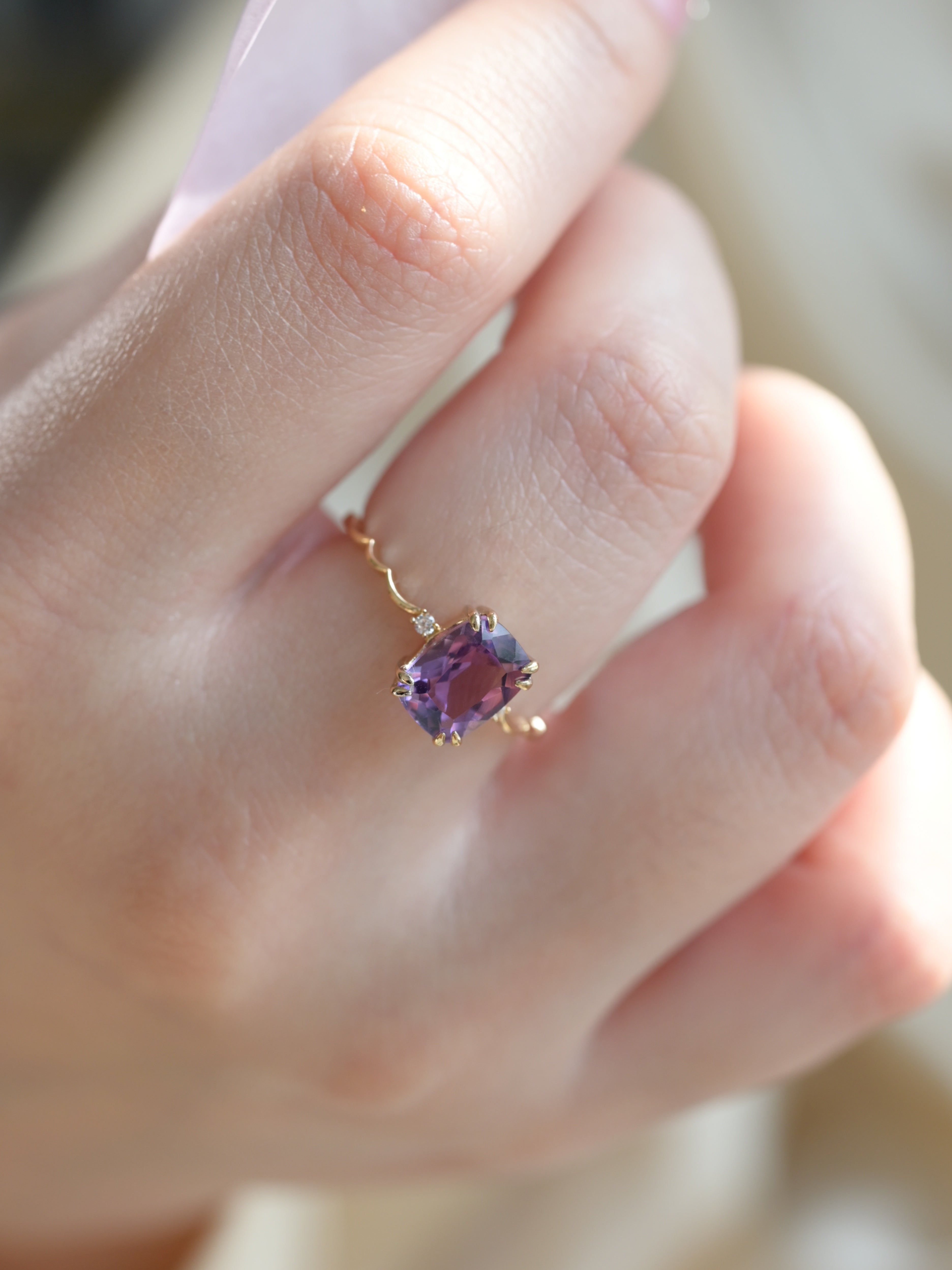 Ispirato dalla tranquillità del crepuscolo, questo anello di ametista cattura la dolce transizione tra il giorno e la notte. La morbida tonalità viola evoca tranquillità interiore e pace, mentre il taglio smeraldo pulito incarna chiarezza e forza. Abbinato a una montatura meticolosamente realizzata, questo design rappresenta un'eleganza moderna radicata in una bellezza senza tempo—perfetto per chi cerca una sofisticazione semplice.