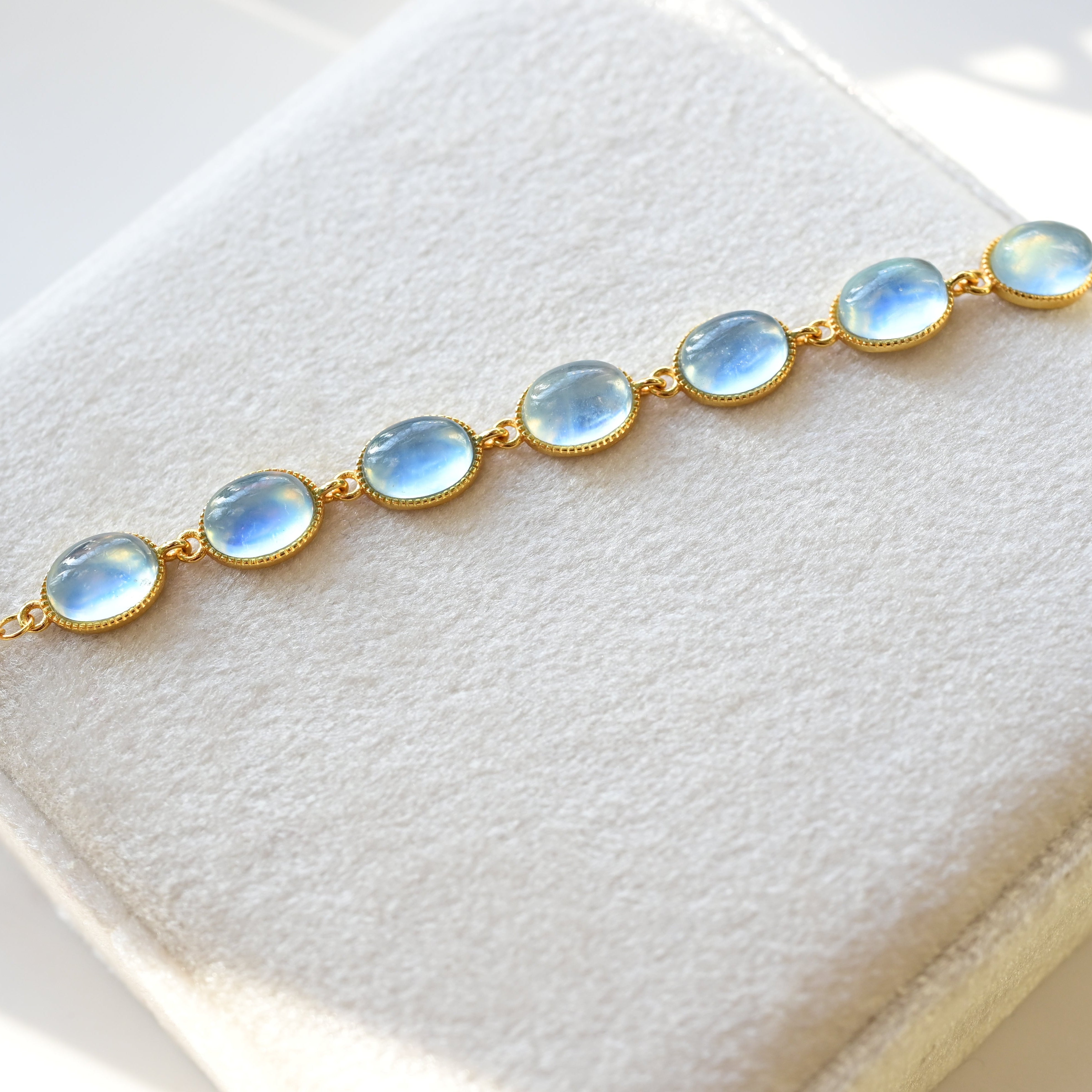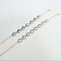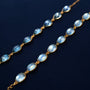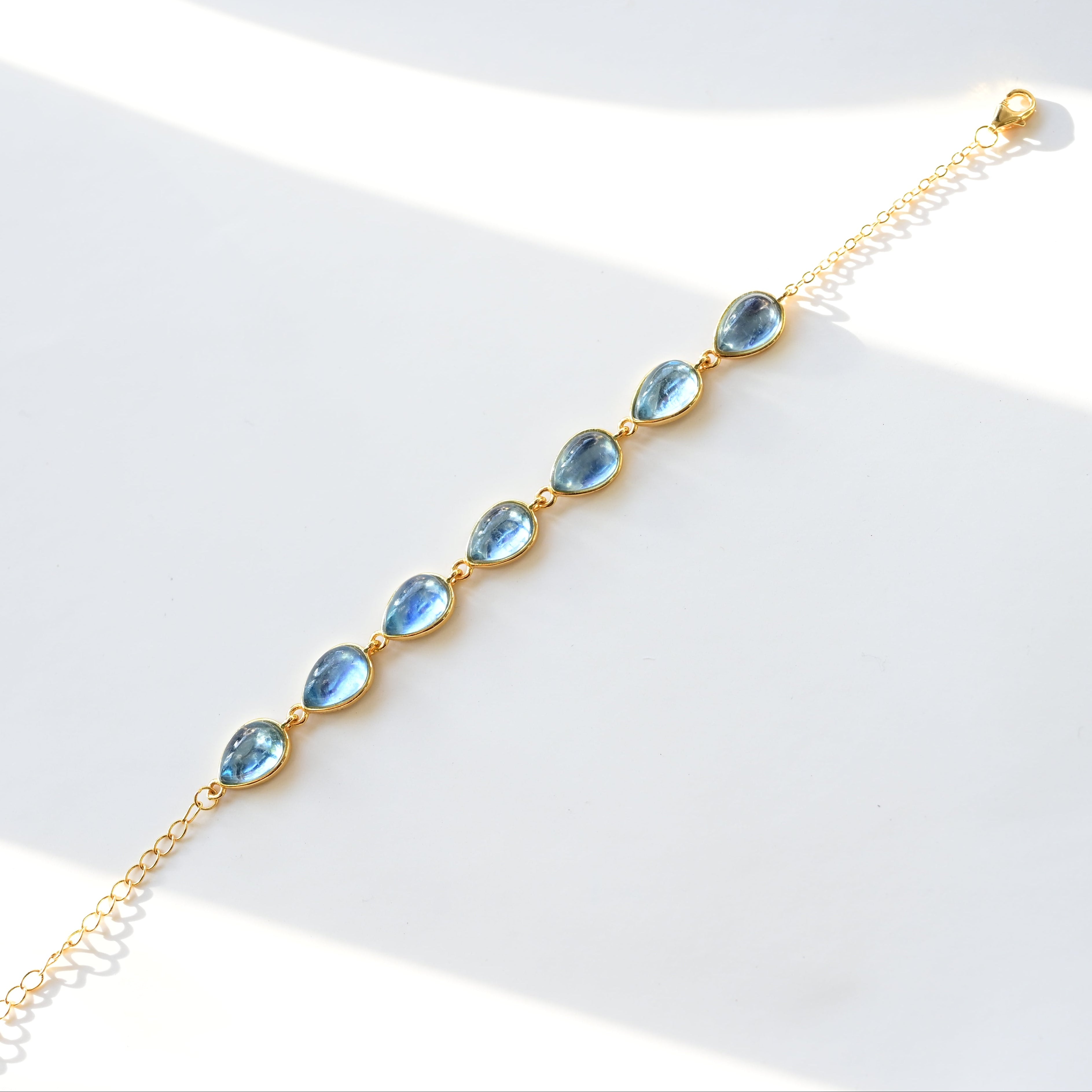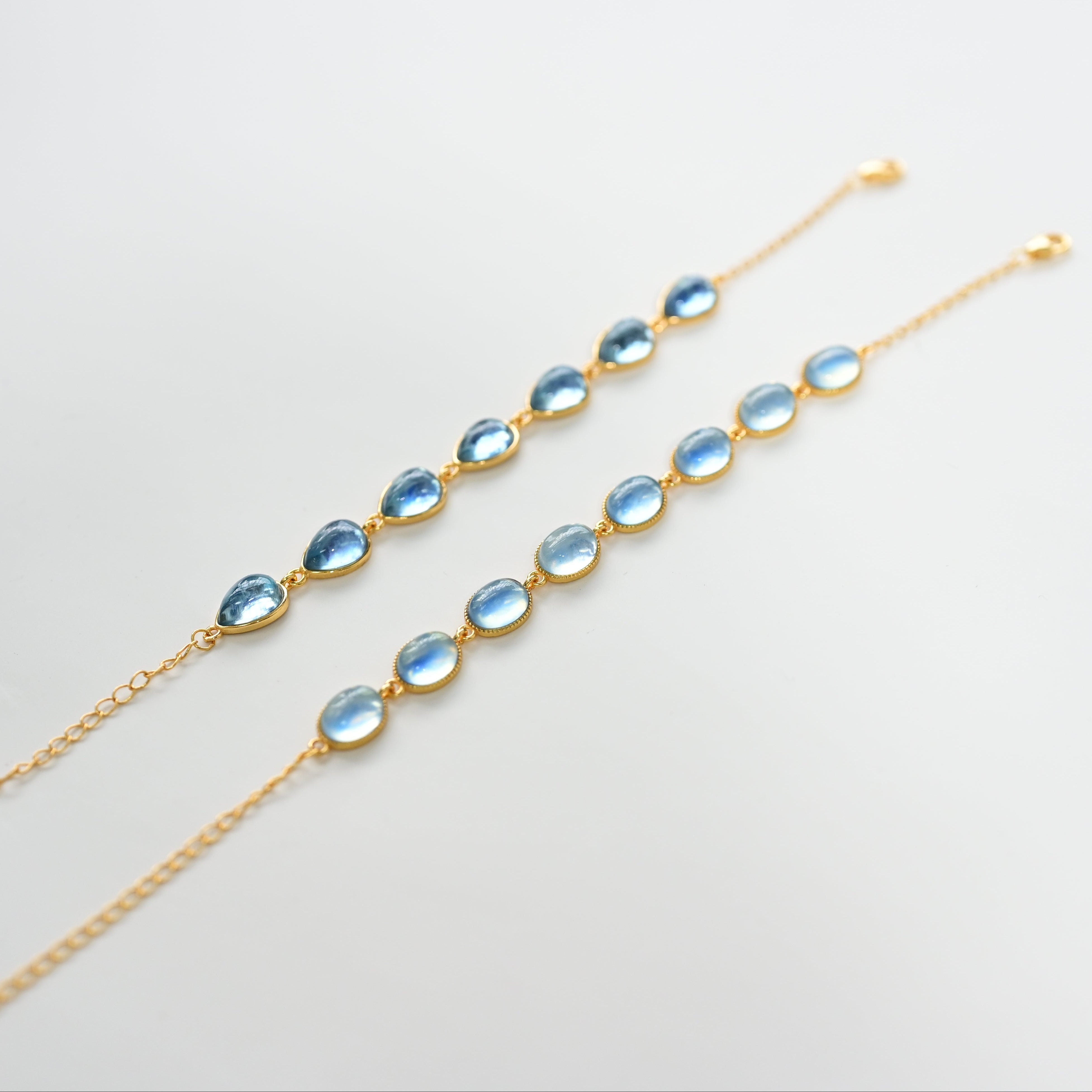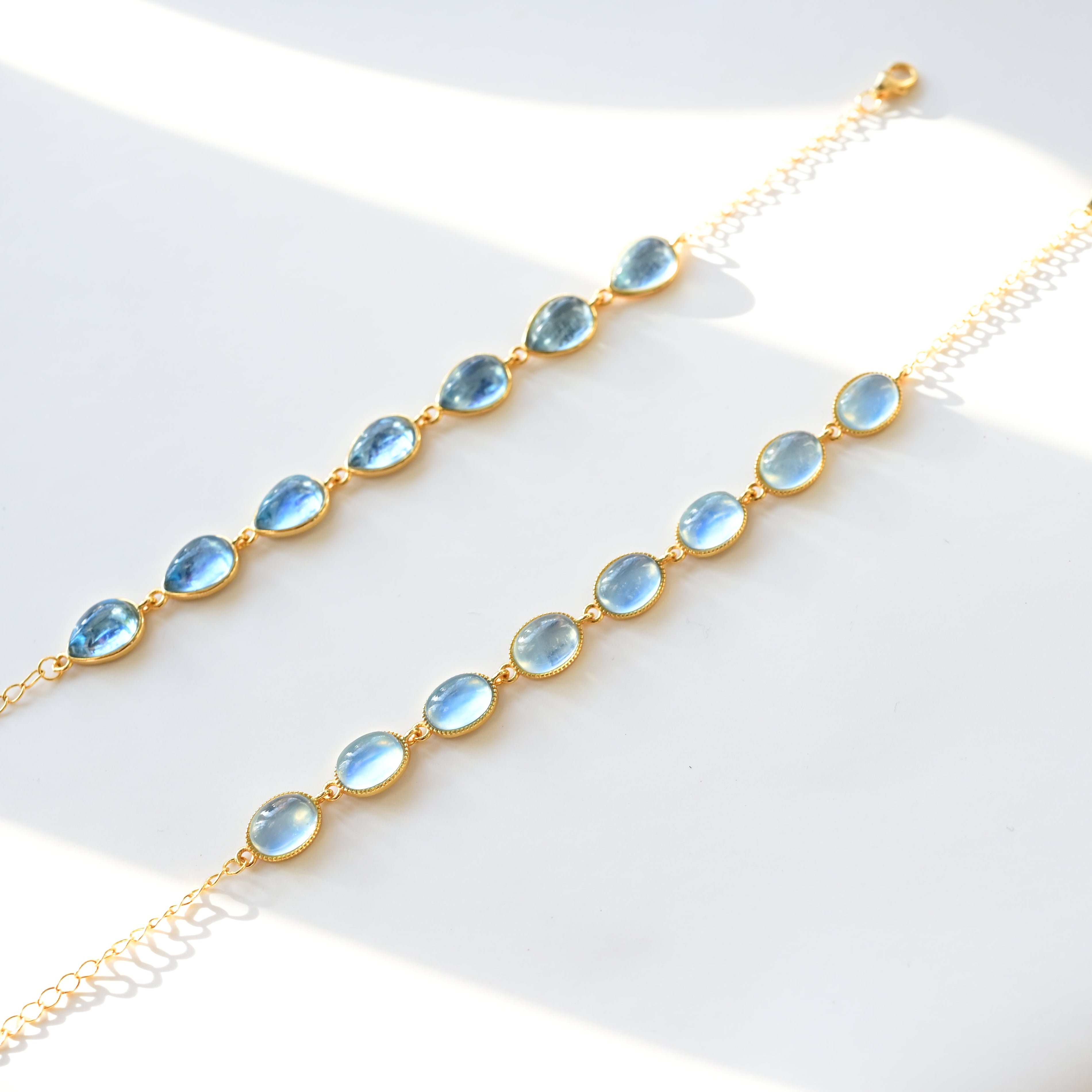 Inspired by the gentle movement of water and light, this aquamarine bracelet series captures the quiet beauty of the ocean. Translucent blue stones are arranged in a flowing rhythm, reflecting softness, clarity, and calm. Set in warm gold-tone frames, each stone appears to float effortlessly along the wrist, creating a design that feels both refined and naturally elegant. The result is a timeless piece that celebrates fluidity, balance, and everyday sophistication.