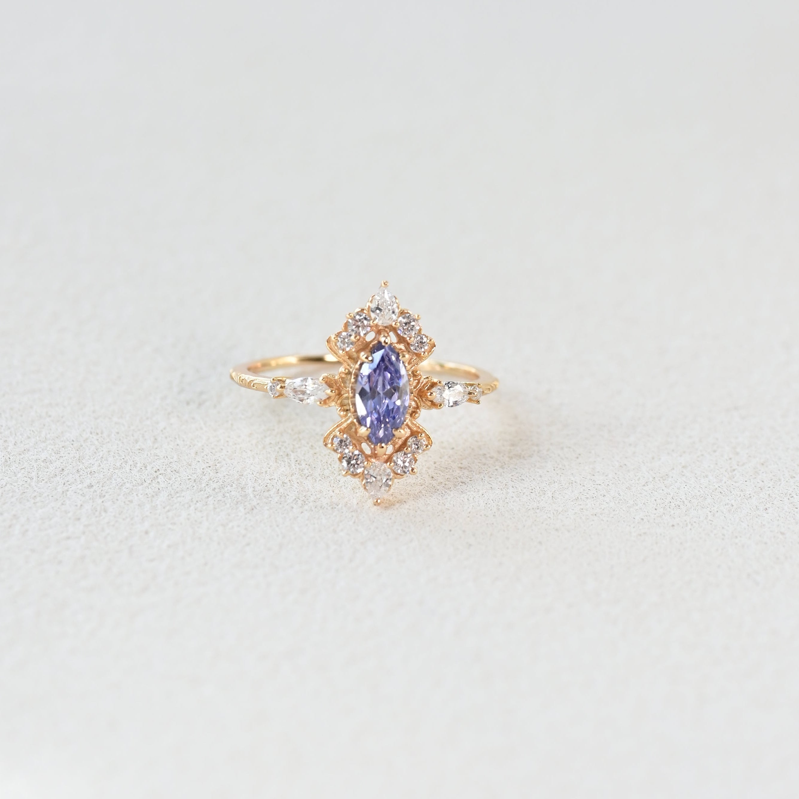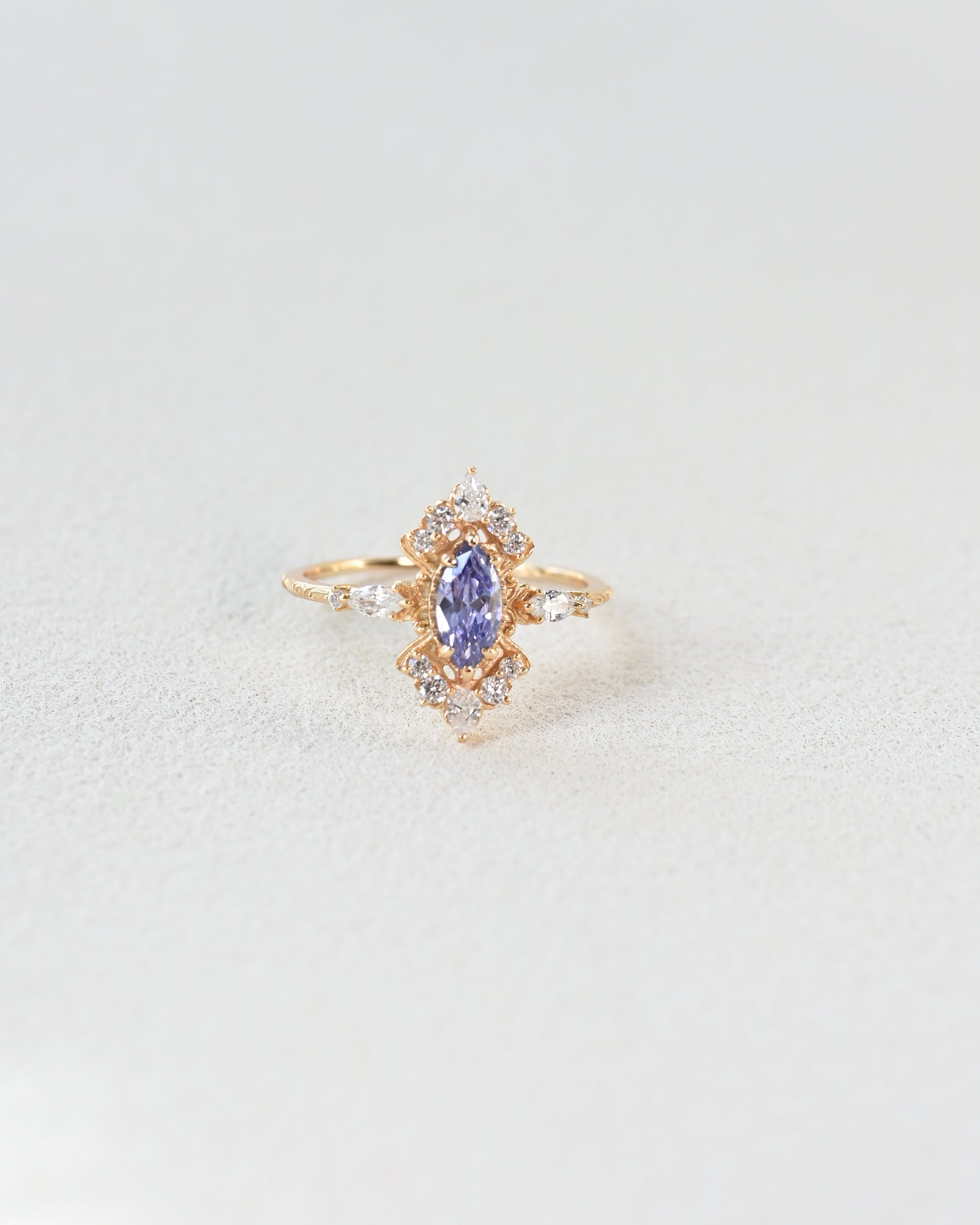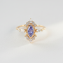 Inspired by the quiet glow of a midnight sky, this ring centers on a Marquise-cut Tanzanite-hue stone, a shape long associated with elegance and feminine strength.