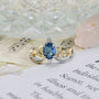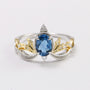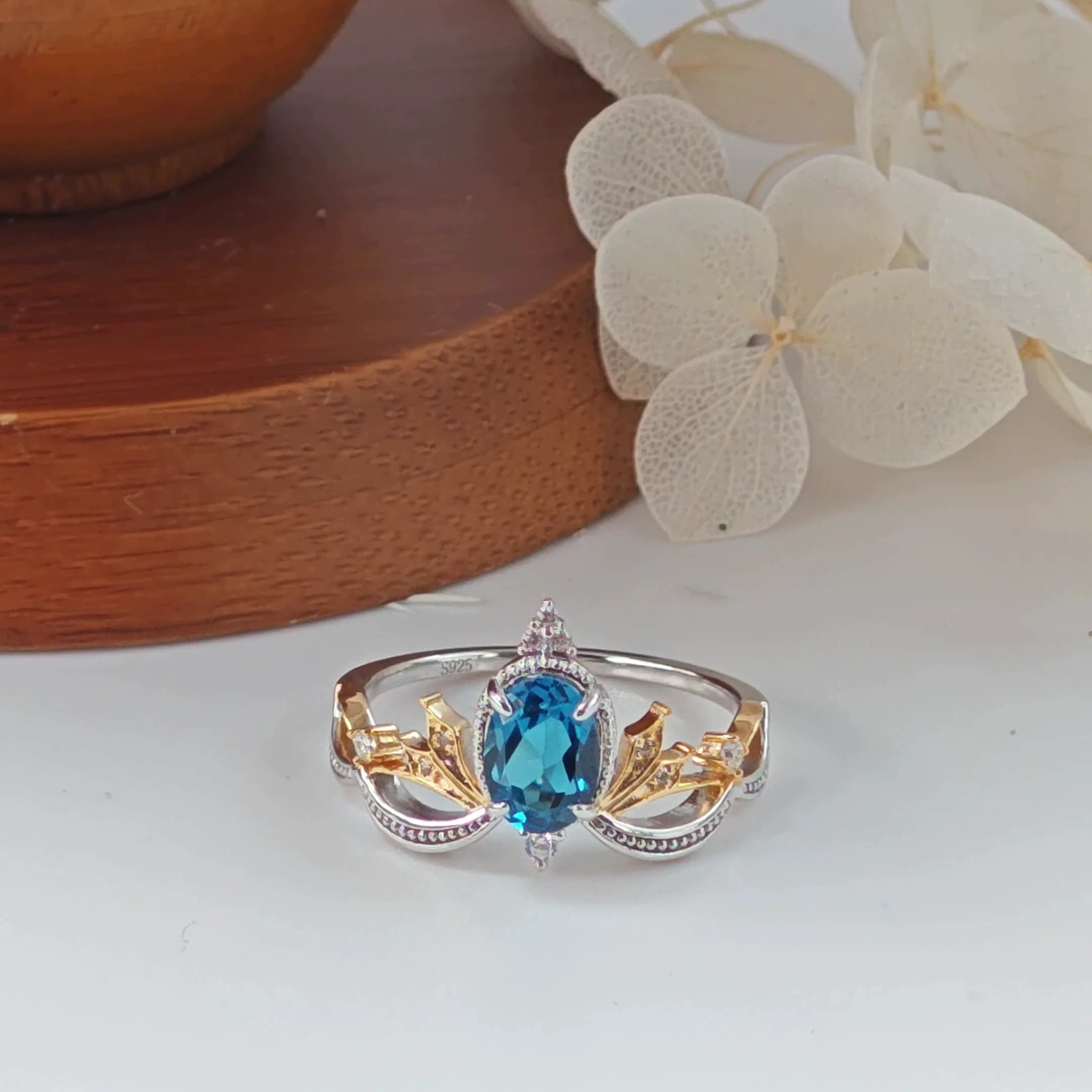 Inspired by the night sky crowned with shimmering stars, the Celestial Crown London Blue Topaz Ring captures the serene depth of twilight. The oval brilliant-cut topaz reflects light like ripples of starlight over calm waters, framed by graceful crown-like details that symbolize elegance, strength, and inner poise.