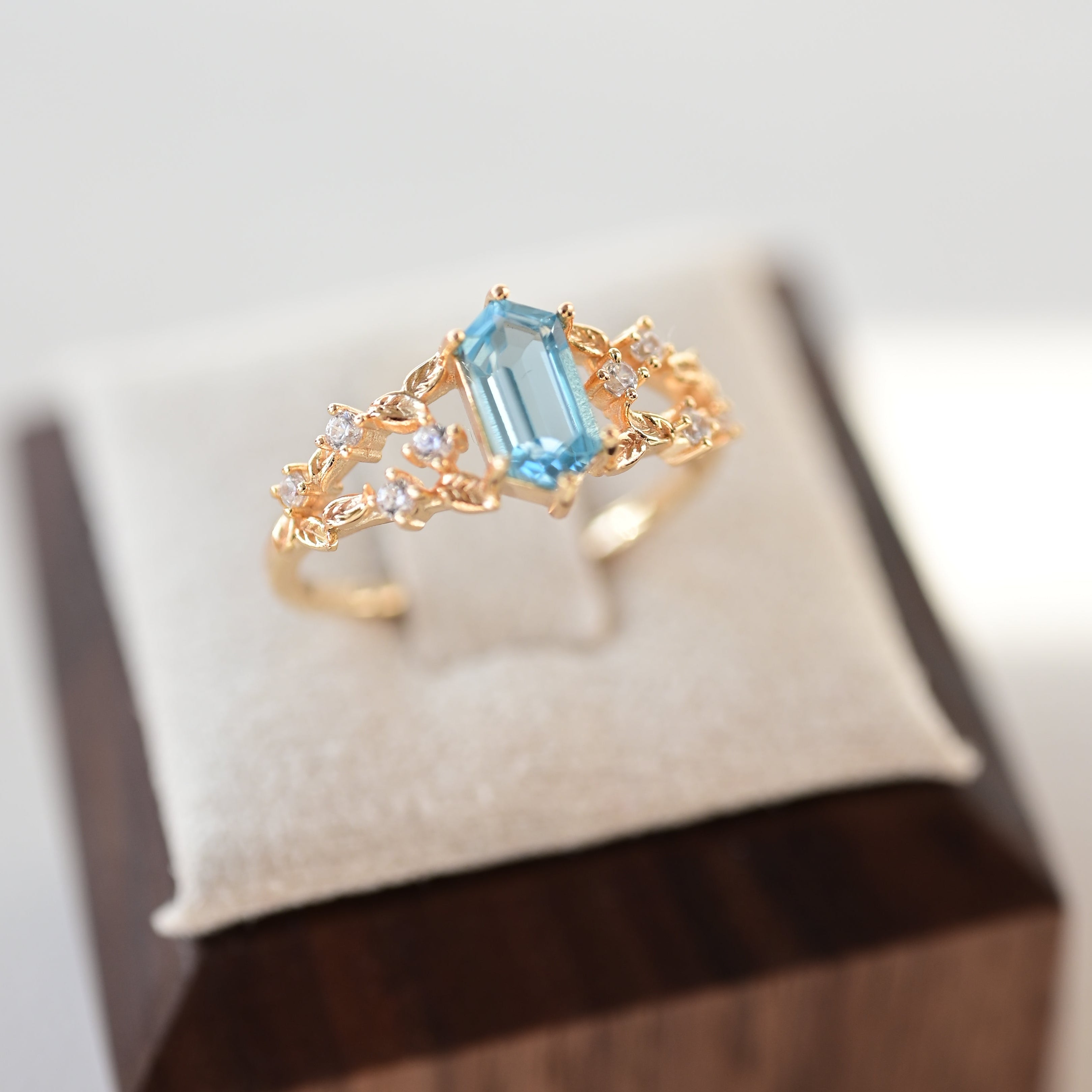 Inspired by the gentle dance of sunlight through forest leaves, the Emerald Cut London Blue Topaz Leaf Ring captures the essence of calm elegance and natural growth. The emerald-cut topaz, with its mirror-like facets, reflects tranquil blue tones reminiscent of a clear sky after rain. Delicate leaf motifs intertwine along the band — a poetic ode to renewal, grace, and the quiet beauty found in nature’s rhythm.