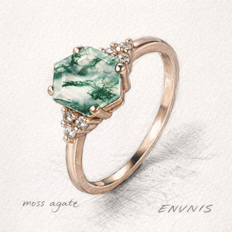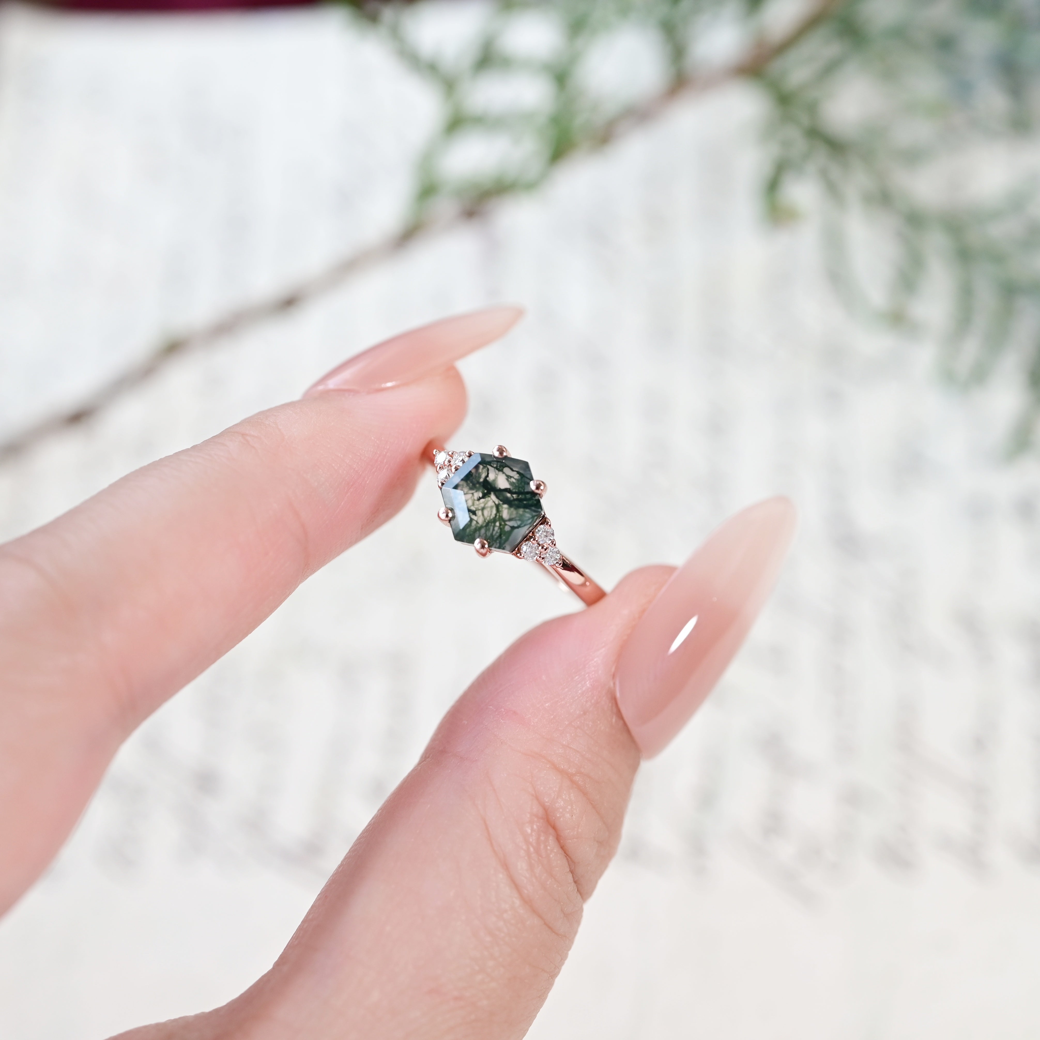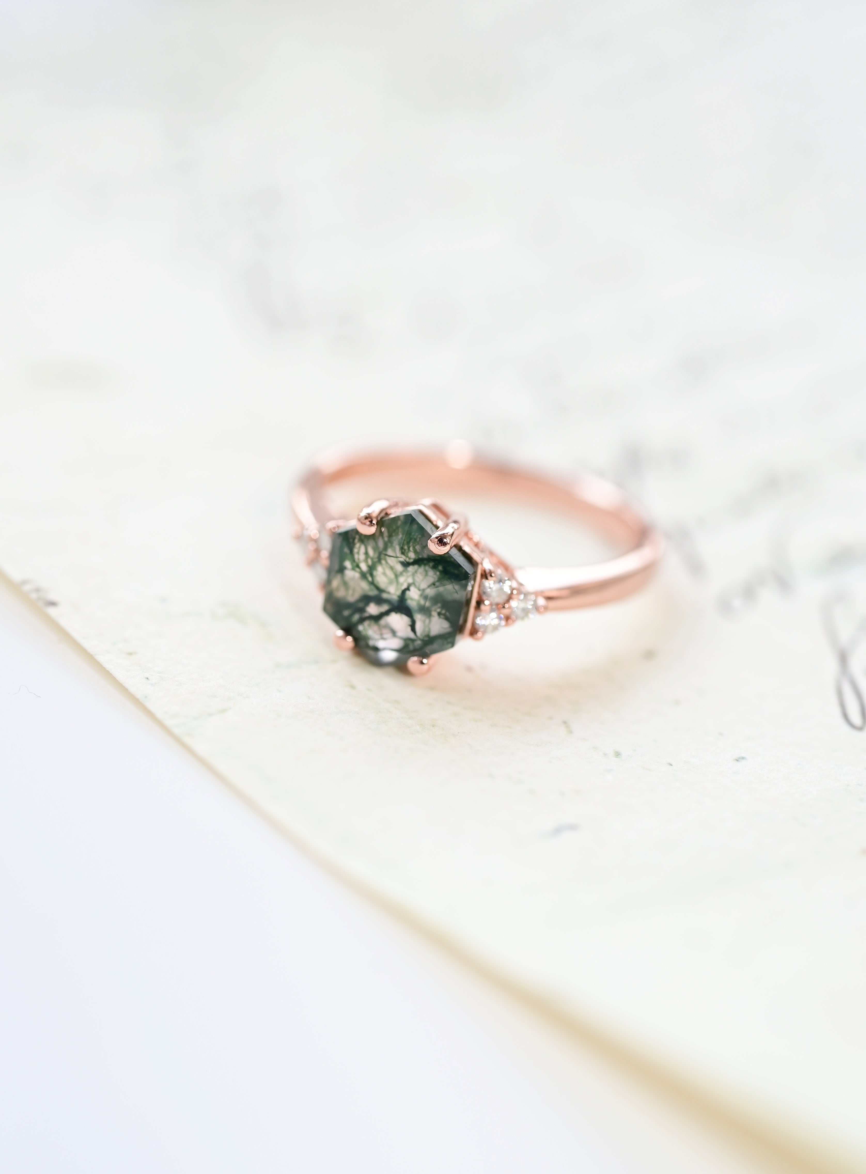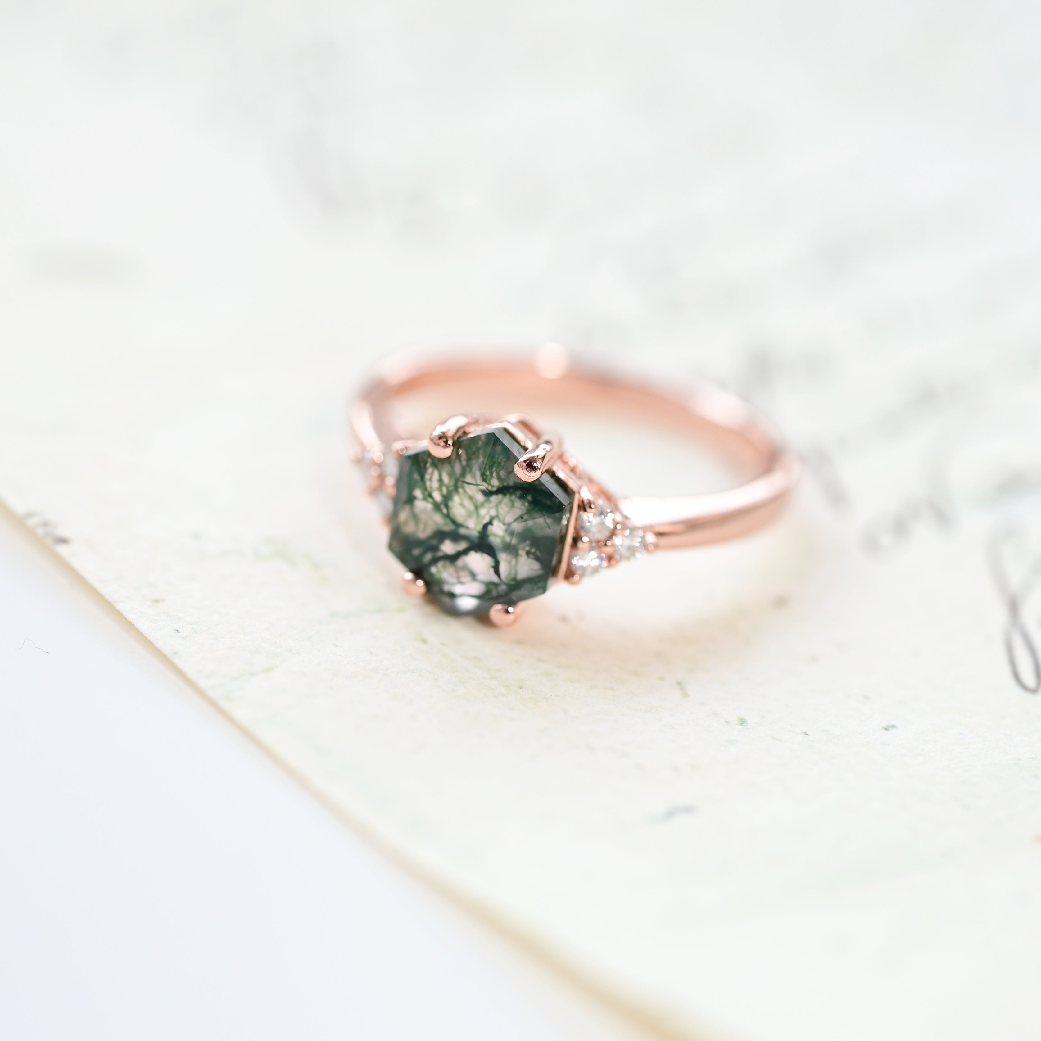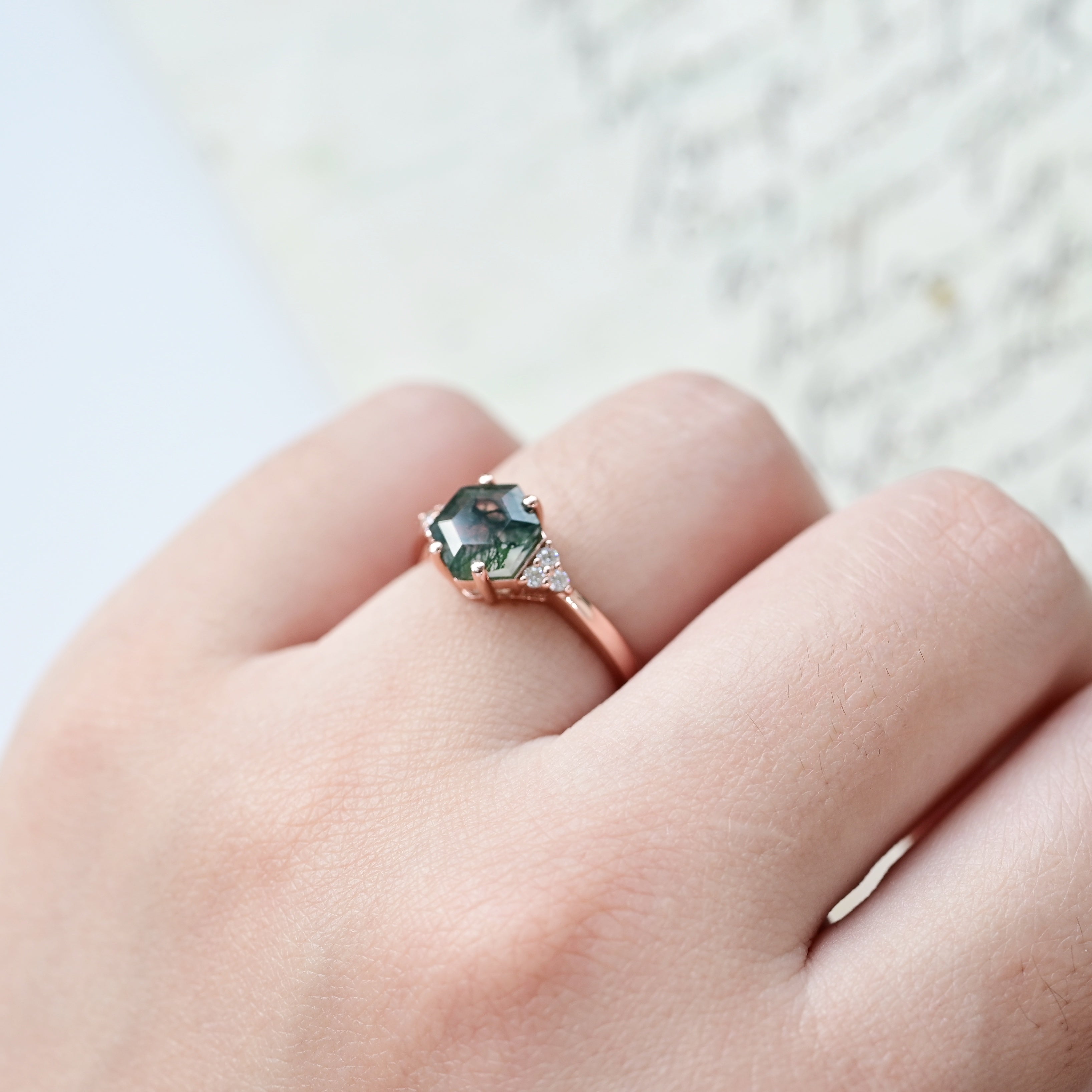 The Hexagonal Moss Agate Ring is inspired by nature’s intricate designs, where every stone tells its own story through the unique patterns of moss agate. The hexagonal shape adds modern sophistication to this natural beauty, while the rose gold vermeil setting brings warmth and refinement to the piece. The subtle brilliance of cubic zirconia accents highlights the beauty of the moss agate, making this ring a perfect balance of nature and elegance.