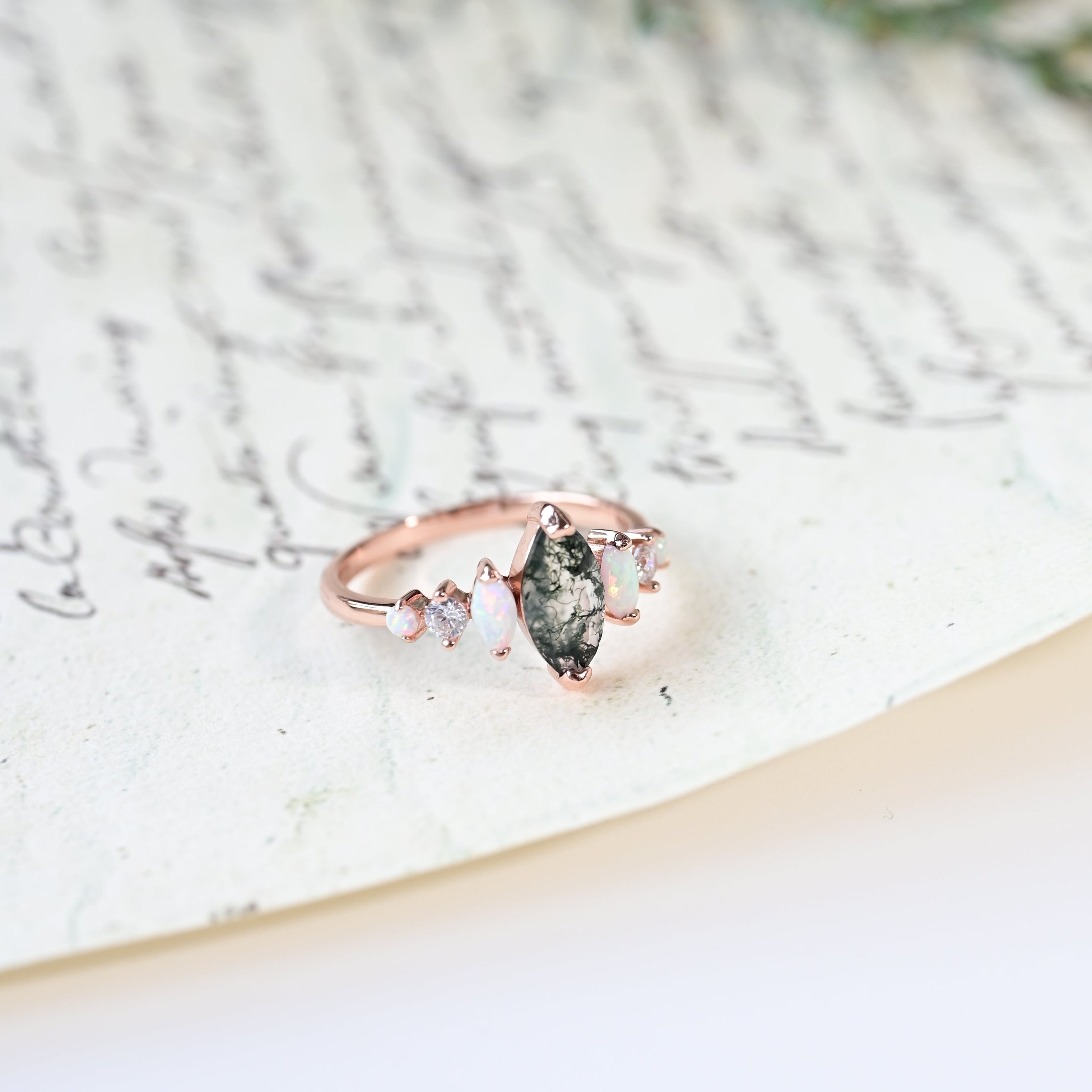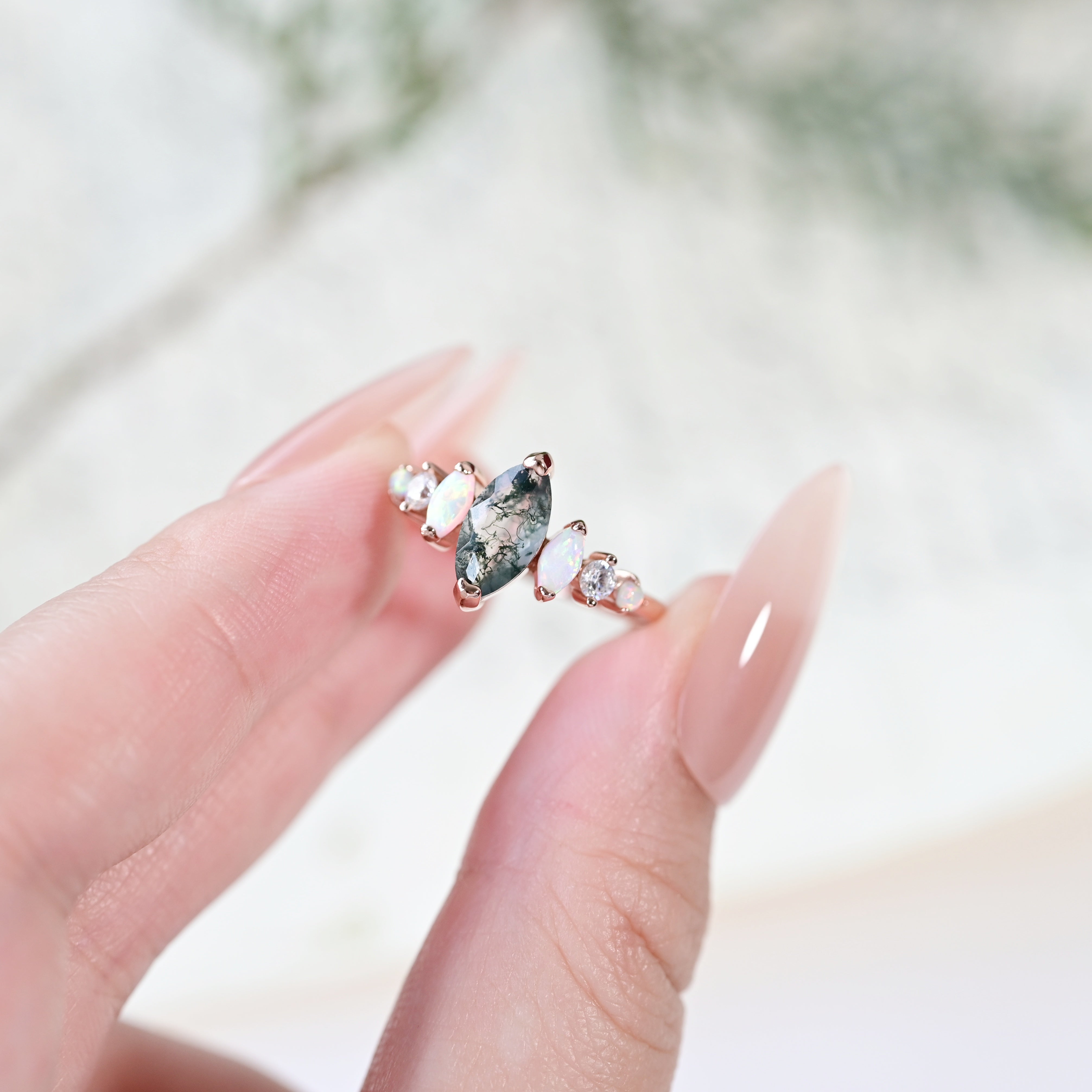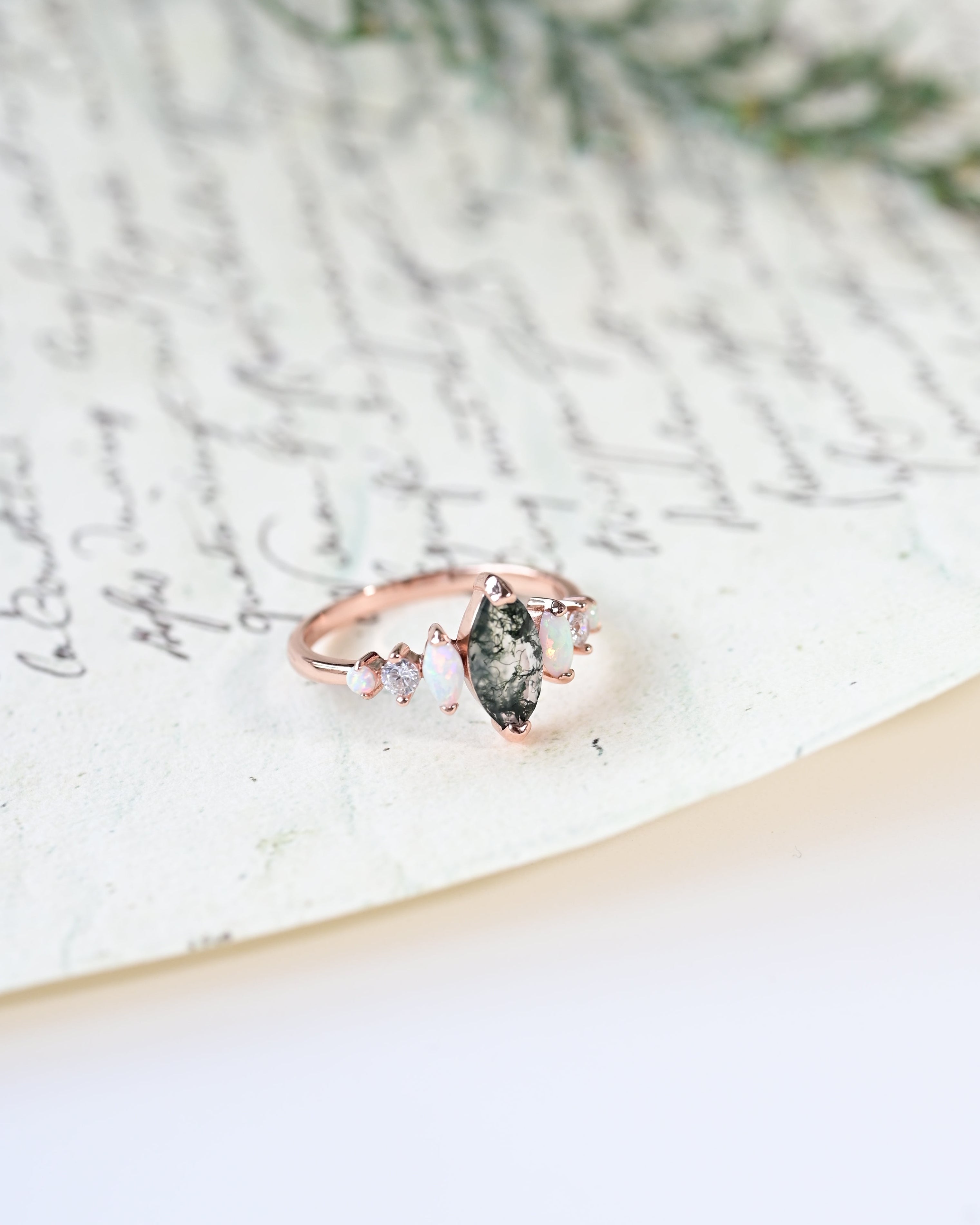 The Marquise Moss Agate & Opal Ring draws inspiration from nature’s beauty, with a 5 × 10 mm marquise-cut moss agate that captures the essence of growth and harmony. Surrounded by sparkling opals and cubic zirconia, this design brings a touch of elegance and modern charm.