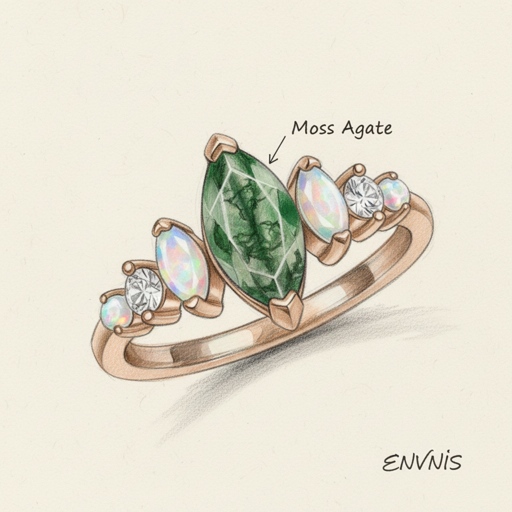 Main Stone: Marquise-cut Moss Agate (5 × 10 mm)