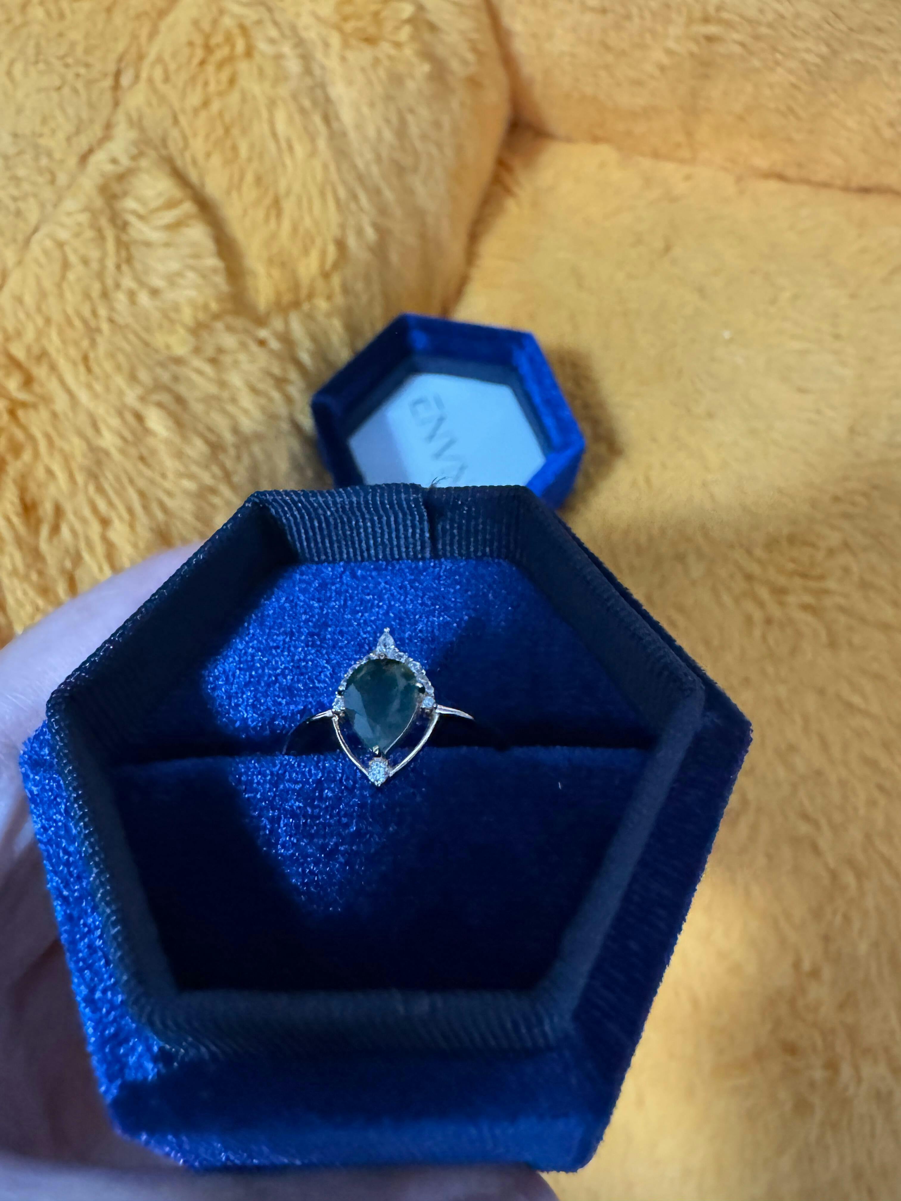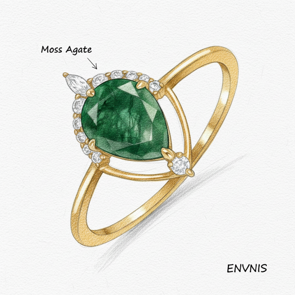 Inspired by the beauty of natural simplicity, the Minimalist Geometric Moss Agate Ring captures calm elegance in its purest form. The pear-cut moss agate resembles a drop of forest dew, while the open geometric frame adds a touch of modern artistry. It’s a piece that celebrates harmony — between nature and design, strength and softness.