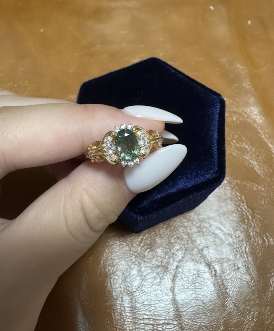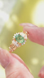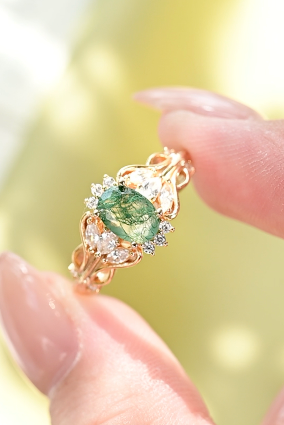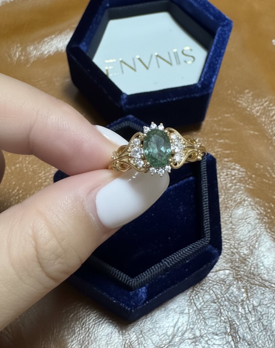 The Moss Agate Verdant Grace Ring is inspired by nature’s quiet elegance. Its translucent moss agate centerpiece holds a miniature forest — delicate green veins like whispering vines and meandering streams. Openwork filigree, accented with cubic zirconia, echoes sunlight filtering through leaves, while 14K gold plating adds timeless warmth. More than mere adornment, it is a talisman of serenity and strength, carrying the soul of nature at your fingertips.