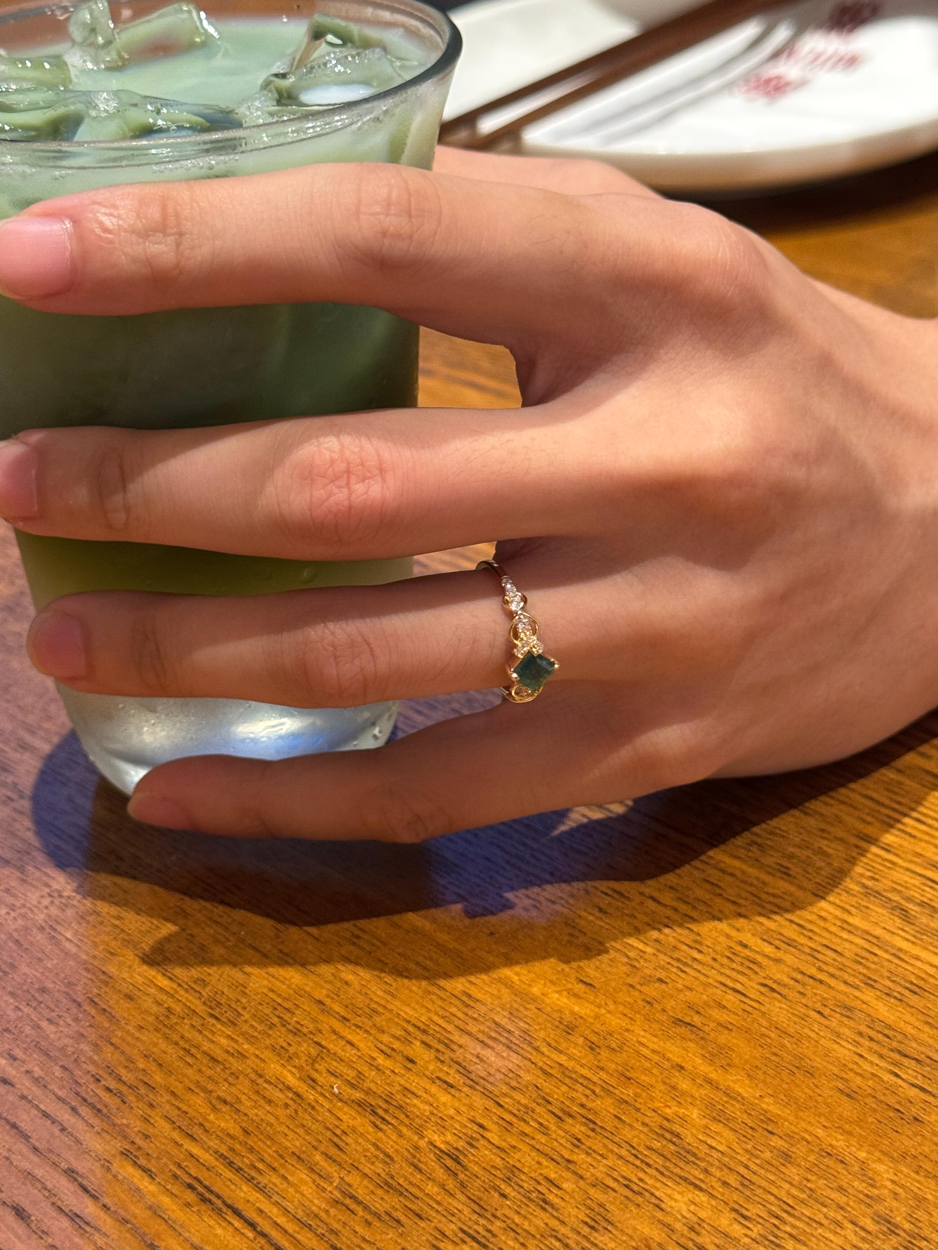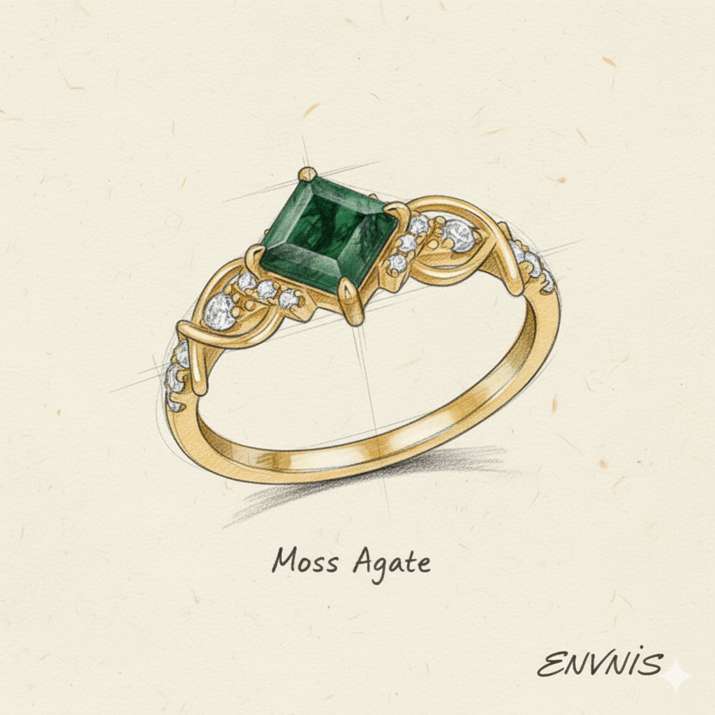 The Mossbound Elegance Ring features a square-cut moss agate with unique green inclusions, resembling miniature forests. Its twined band evokes vine-like growth, blending vintage romance and modern minimalism into a timeless natural elegance.