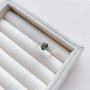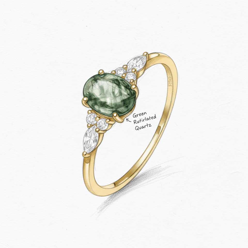 The Oval Green Rutilated Quartz Ring is inspired by the calm beauty of nature and the modern simplicity of clean, refined lines. The soft oval center stone showcases unique moss-green rutile strands — each one like a delicate sketch captured inside crystal. Paired with petite CZ accents in a contemporary cluster arrangement, the design balances organic texture with minimal elegance, creating a piece that feels fresh, airy, and effortlessly graceful.