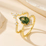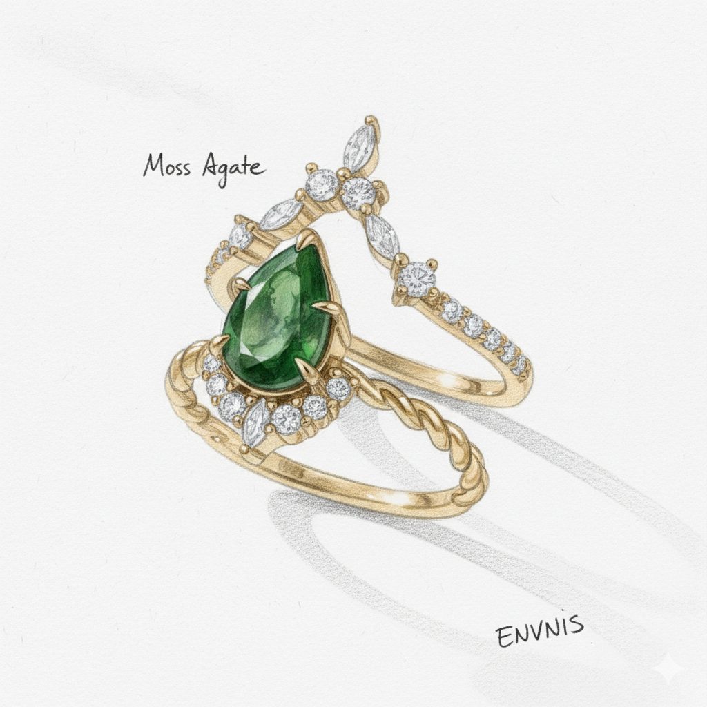 Inspired by the quiet poetry of morning dew on forest vines, the Pear Cut Moss Agate Stacking Ring Set transforms nature’s fleeting beauty into timeless elegance. The elongated pear-cut moss agate resembles a dewdrop resting on leaves, while the twisted band adds movement and depth. Together, they celebrate balance, growth, and the serene strength found in nature’s hidden moments.