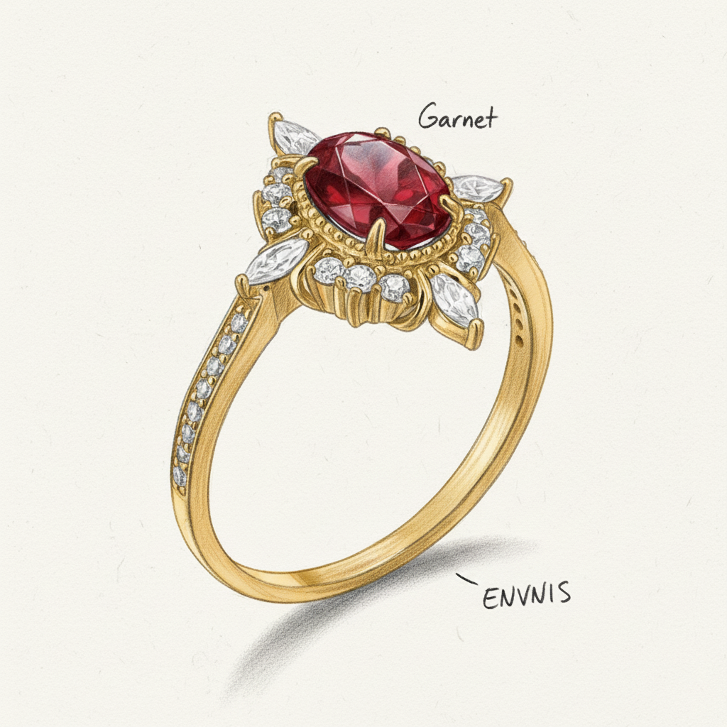 Main Stone: Oval-cut Garnet (5 × 7 mm)