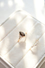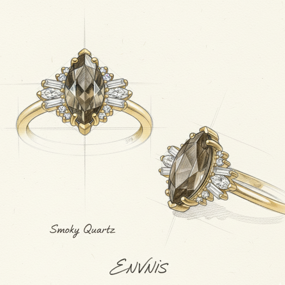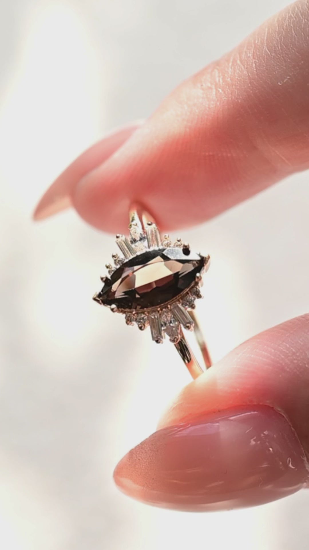 Inspired by the mysterious allure of twilight, this ring captures the elegance of a smoky crystal enveloped in brilliance. The marquise-cut stone, paired with dazzling accents, evokes a sense of regal sophistication and timeless charm.