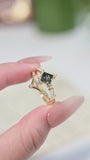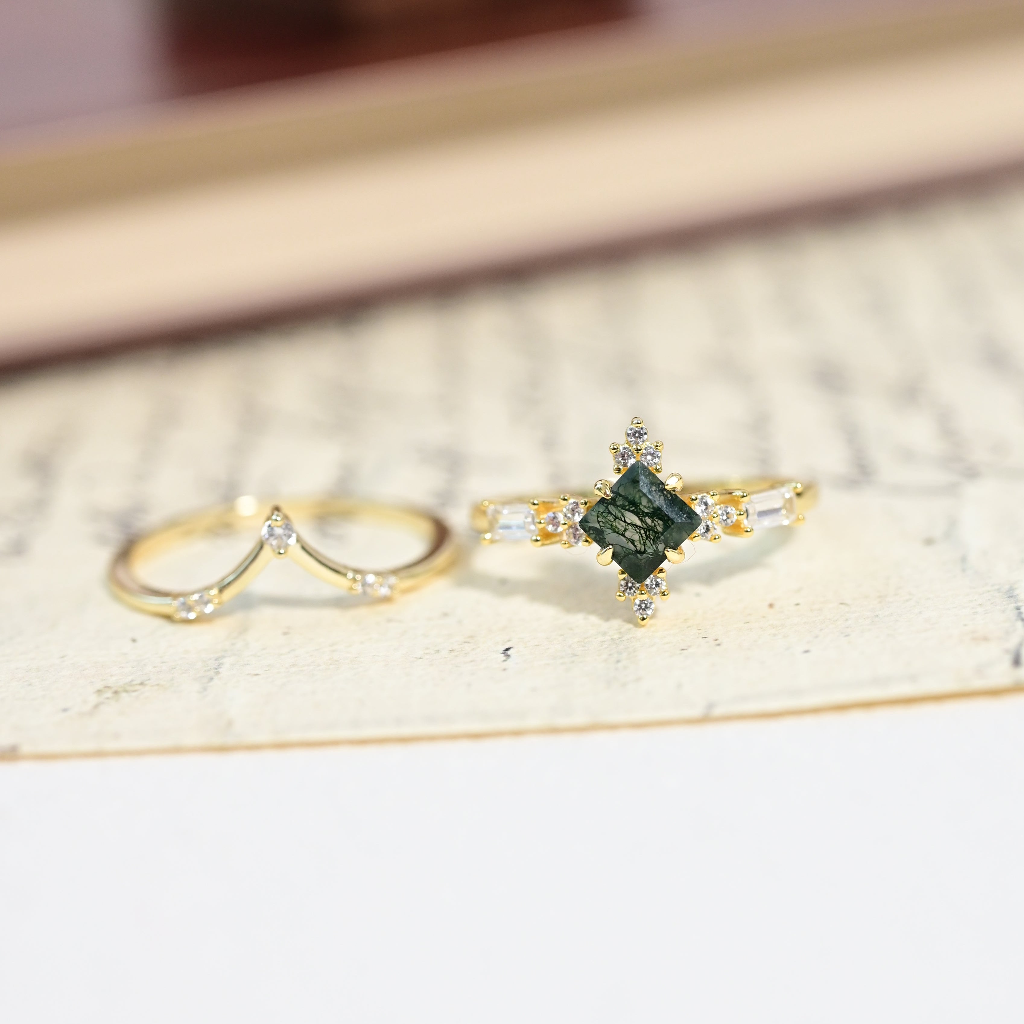 Inspired by the clean lines of modern geometry and the organic beauty of natural stone, the Square Cut Moss Agate Ring Set captures effortless elegance. The square moss agate reflects tranquil forest tones, while the structured bands add a touch of architectural grace — blending nature’s artistry with contemporary refinement.