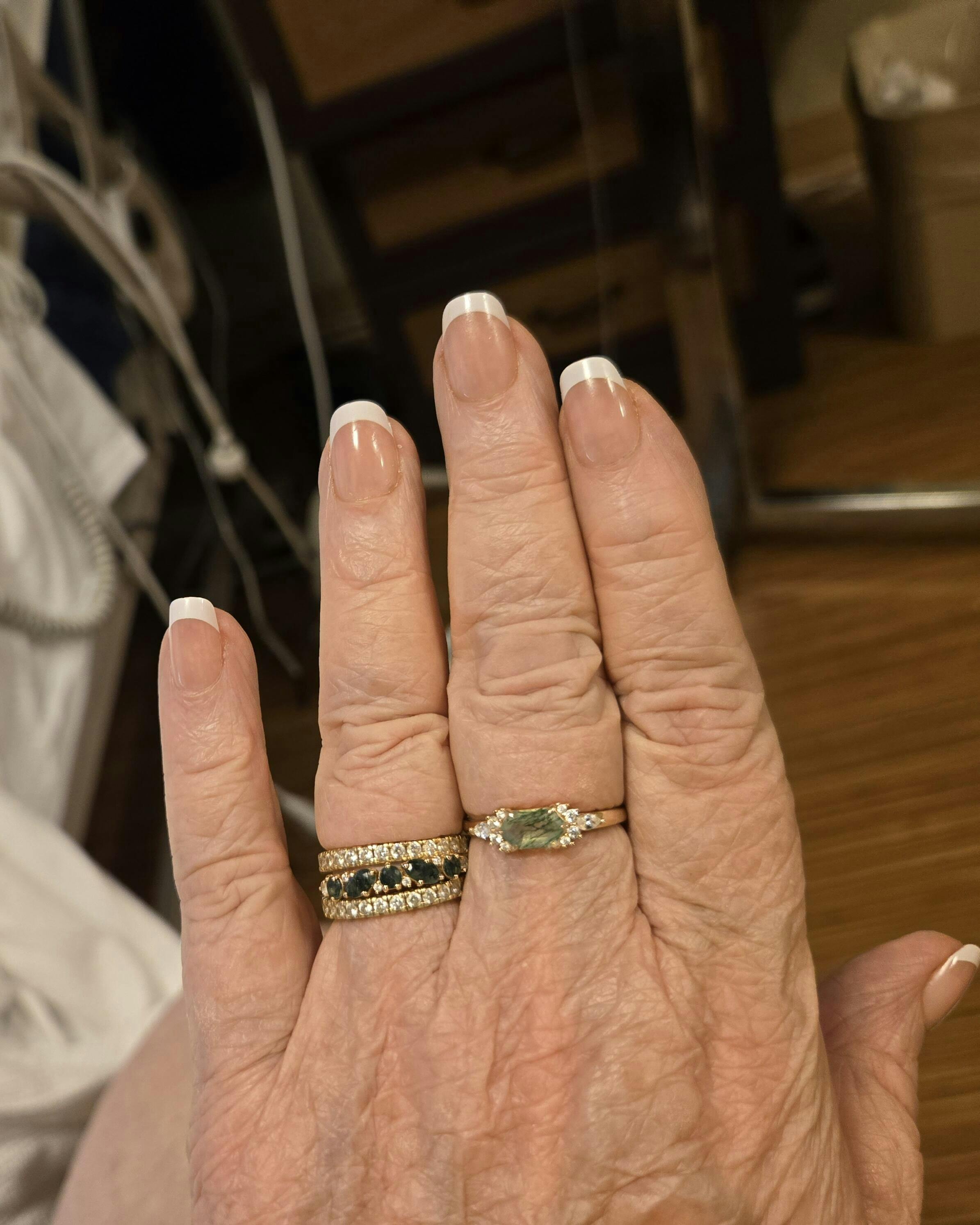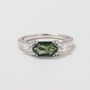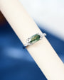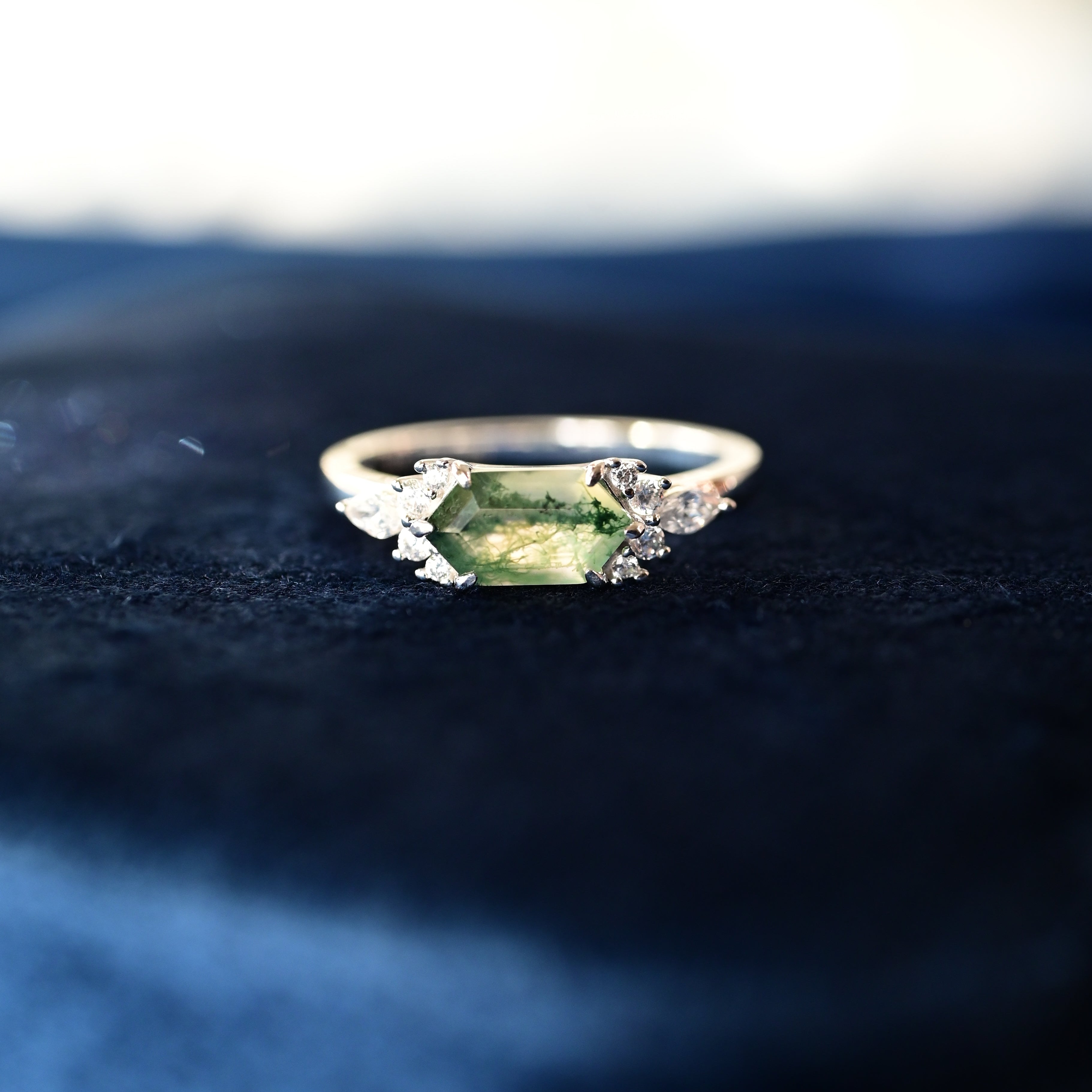Inspired by the serene beauty of forest landscapes, this ring captures the organic mystery of nature through the natural moss agate center stone — each uniquely patterned like a miniature forest. The geometric hexagon cut brings modern structure to the raw, earthy charm of the stone, while the sparkling accents echo dew drops on leaves, blending elegance with grounded tranquility.