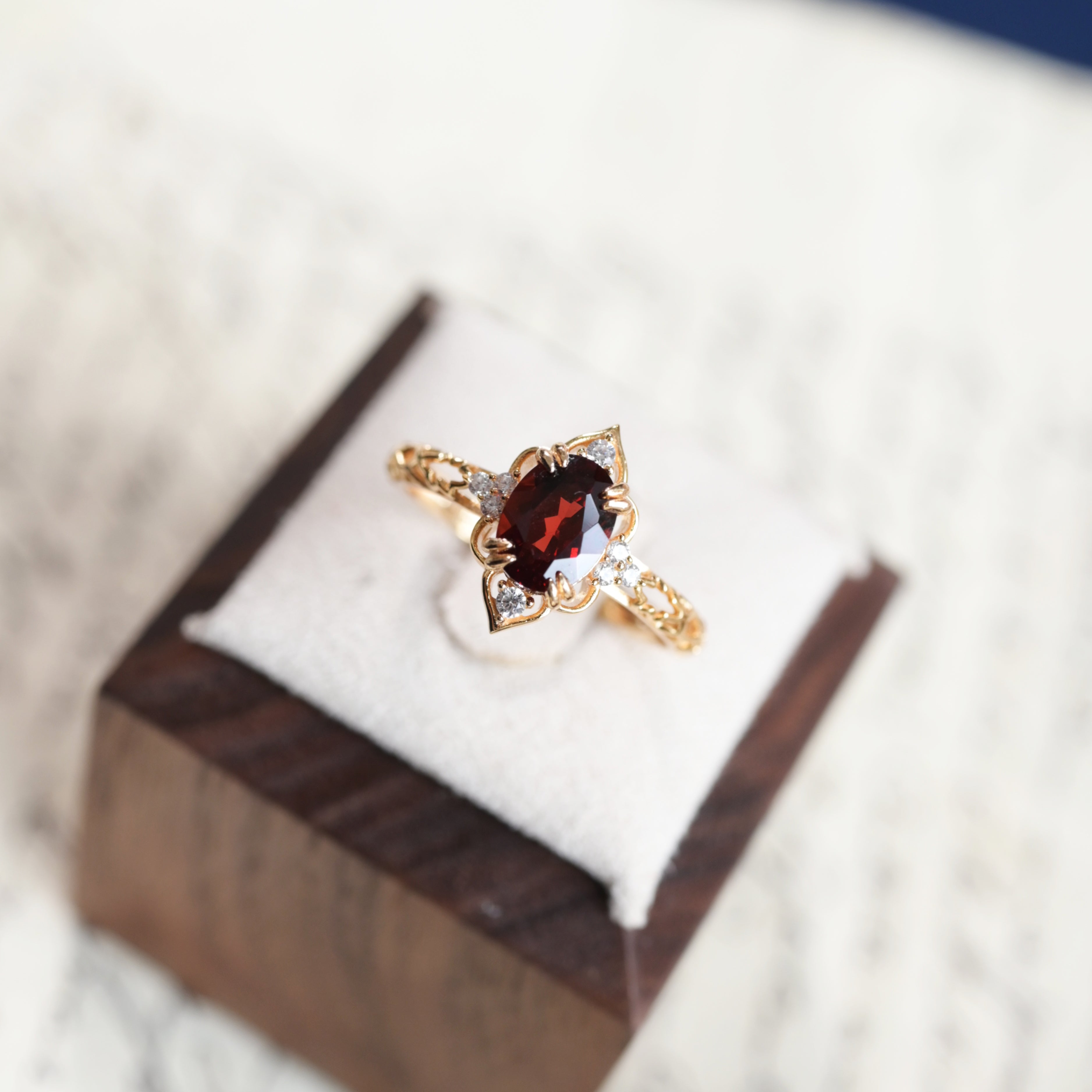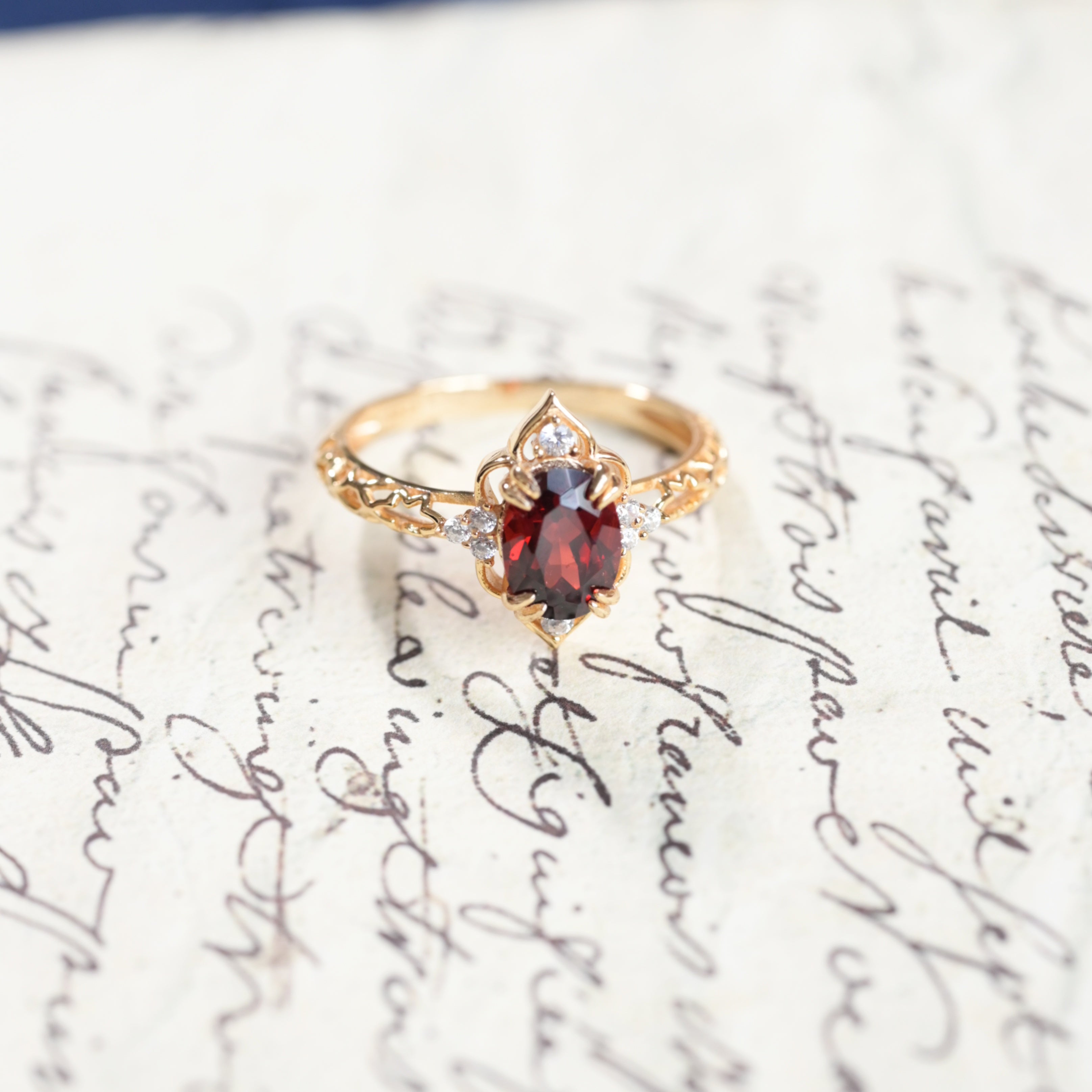 Inspired by vintage royal aesthetics, this ring features an intricately hollowed setting that highlights a deep crimson garnet at its center. The pointed oval silhouette and ornate detailing evoke the grandeur of antique heirlooms, while the rich red hue of the garnet adds a sense of warmth and timeless romance. It's a design that balances bold elegance with classic charm — perfect for those who appreciate both history and beauty in a single piece.