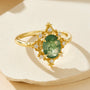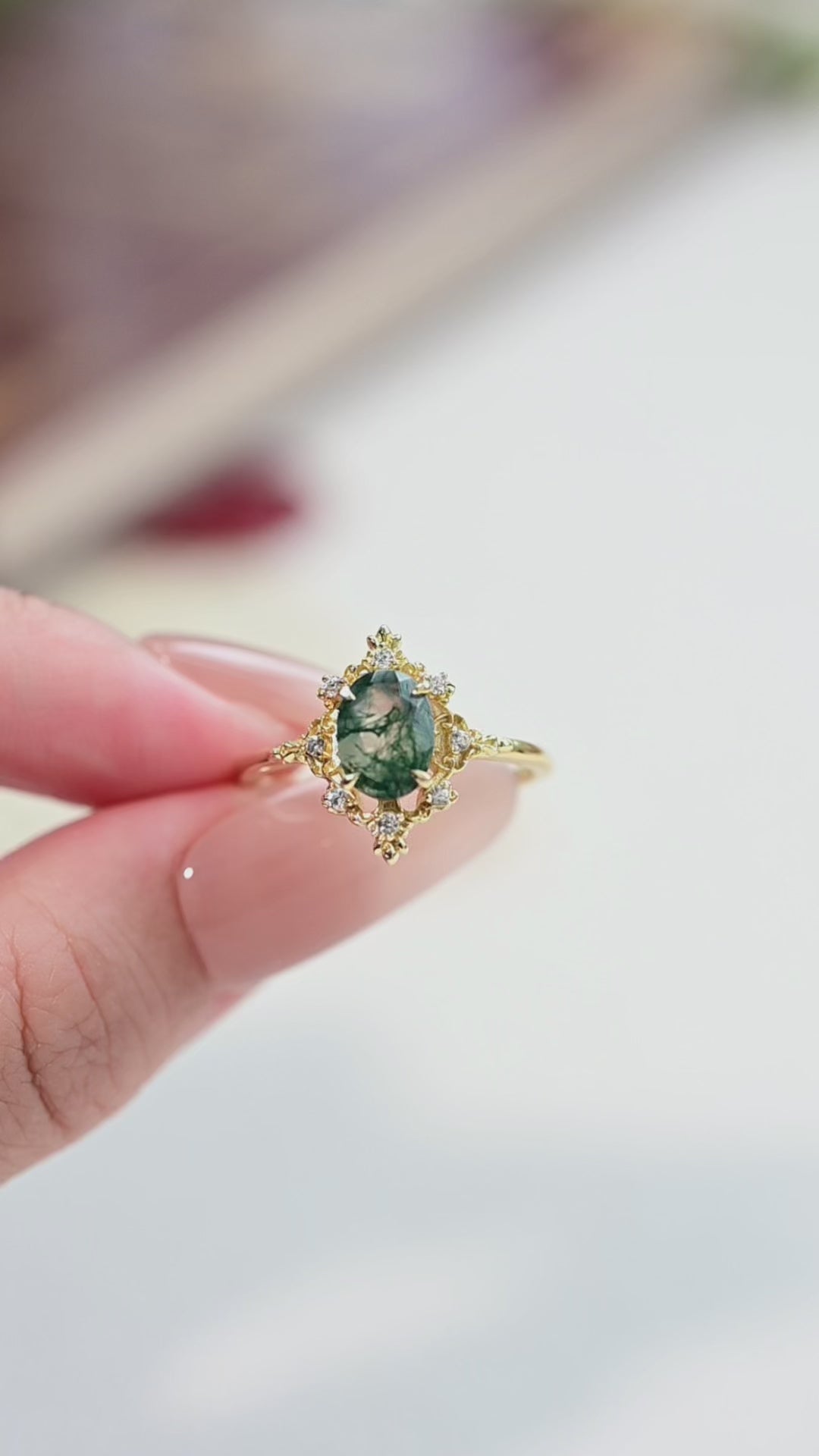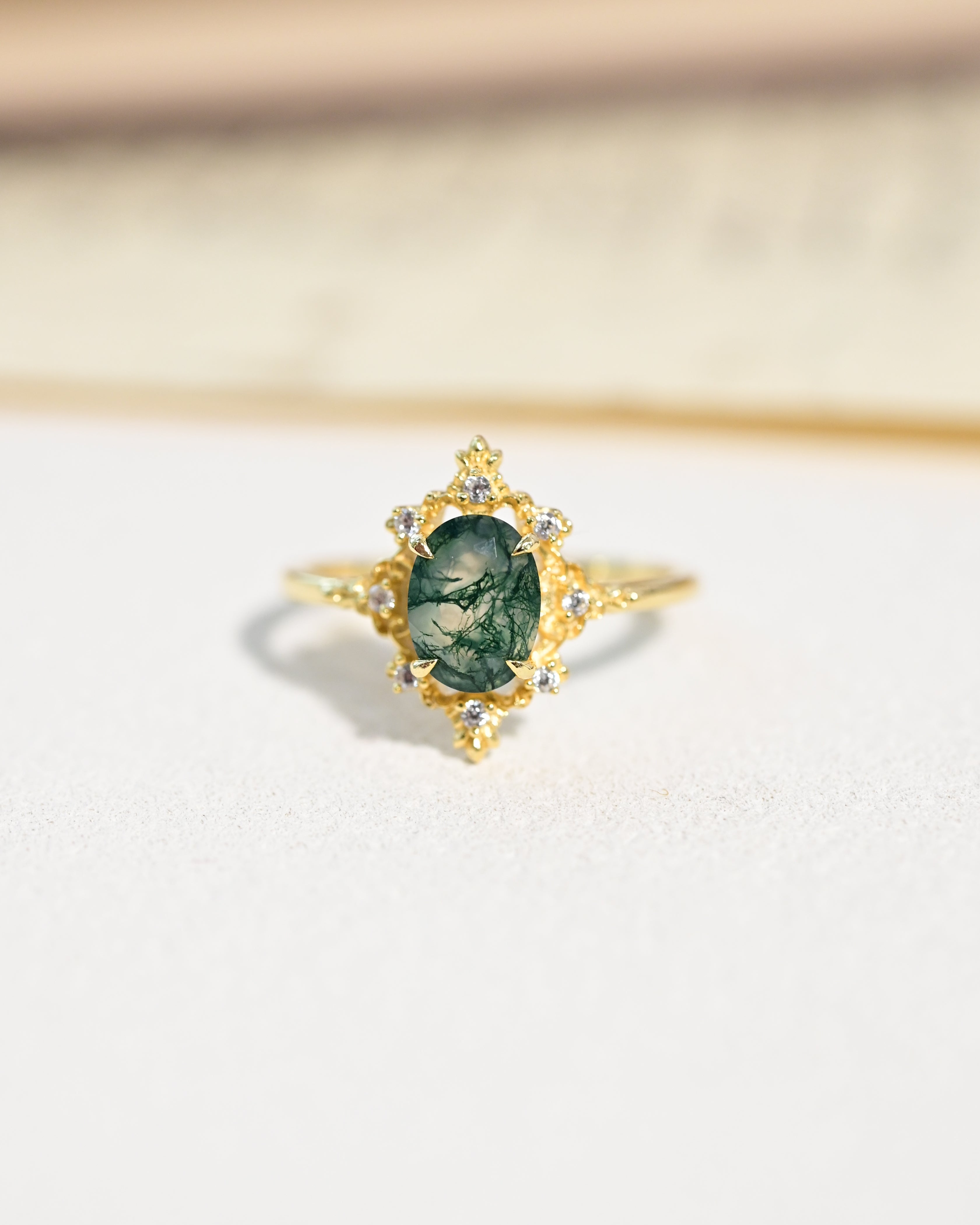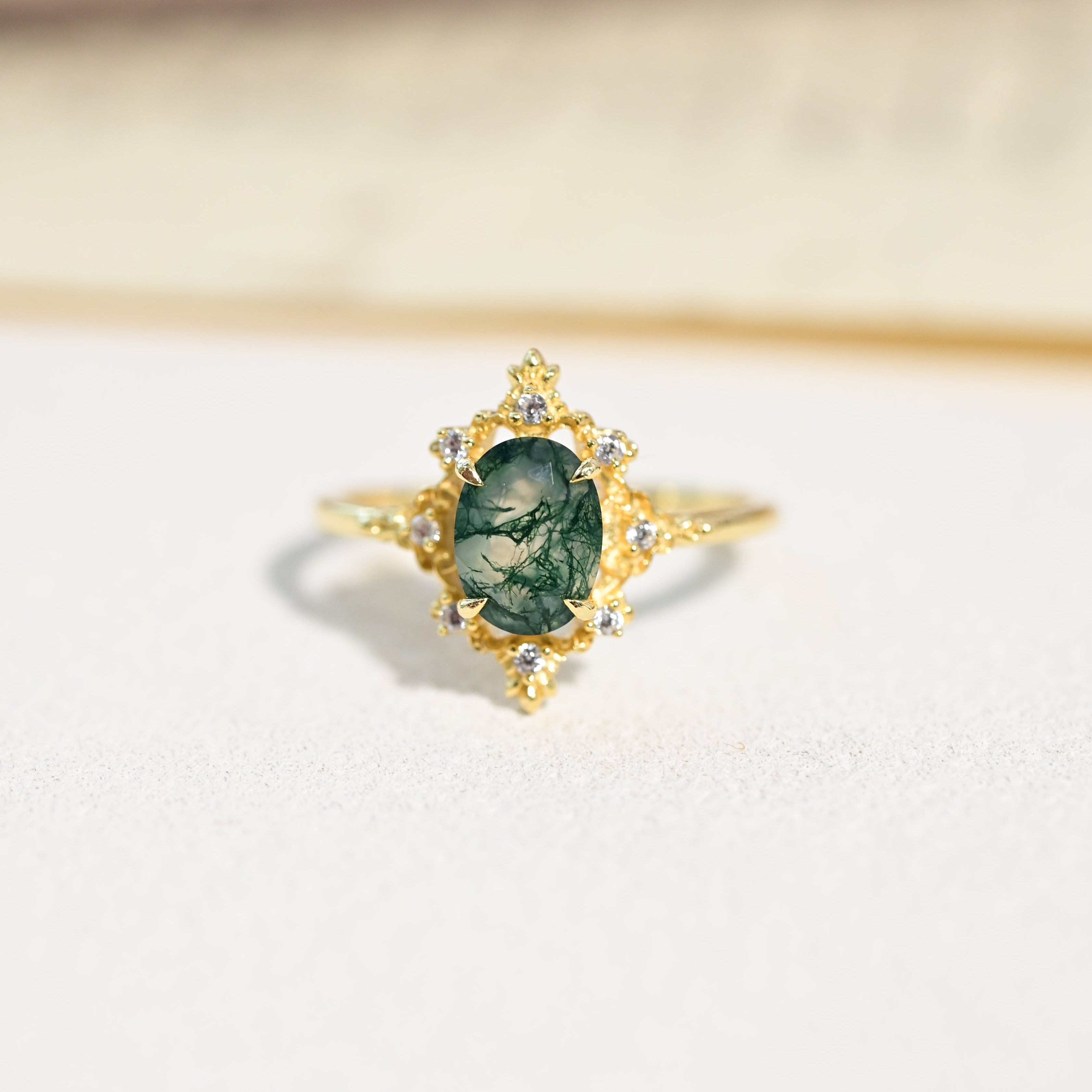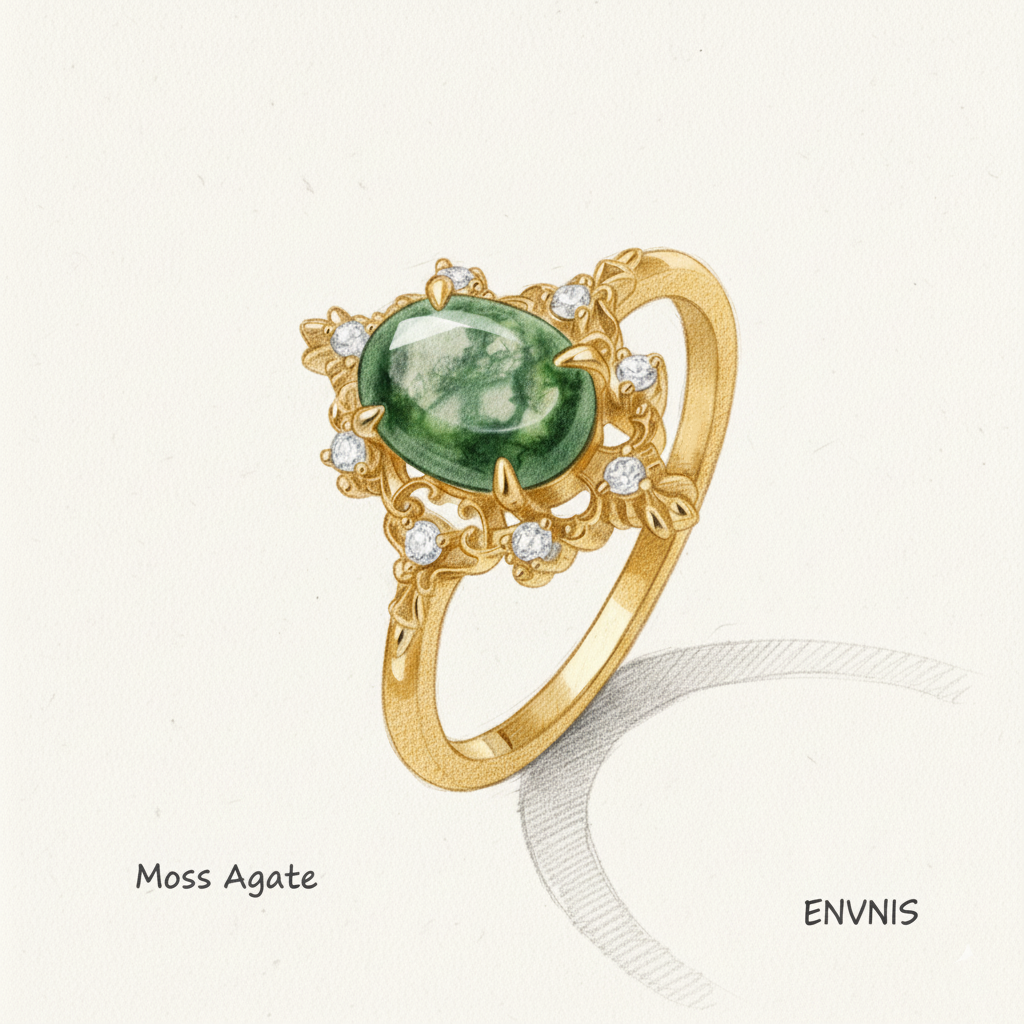 Inspired by vintage floral crowns and the serenity of nature, the Vintage Oval Cut Moss Agate Crown Ring captures quiet nobility in a modern form. The moss agate’s unique inclusions resemble a miniature garden within stone, framed by ornate golden petals — a poetic blend of timeless romance and natural beauty.