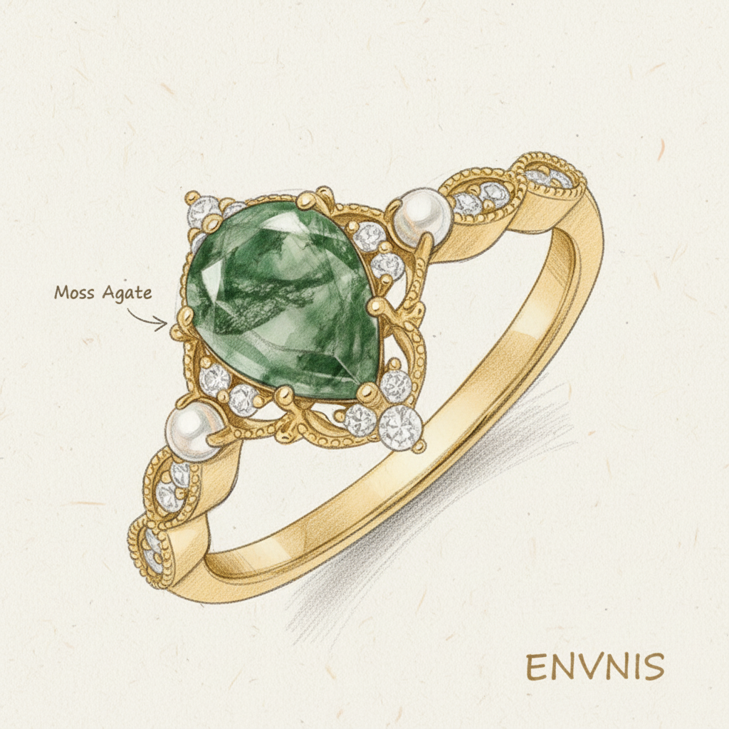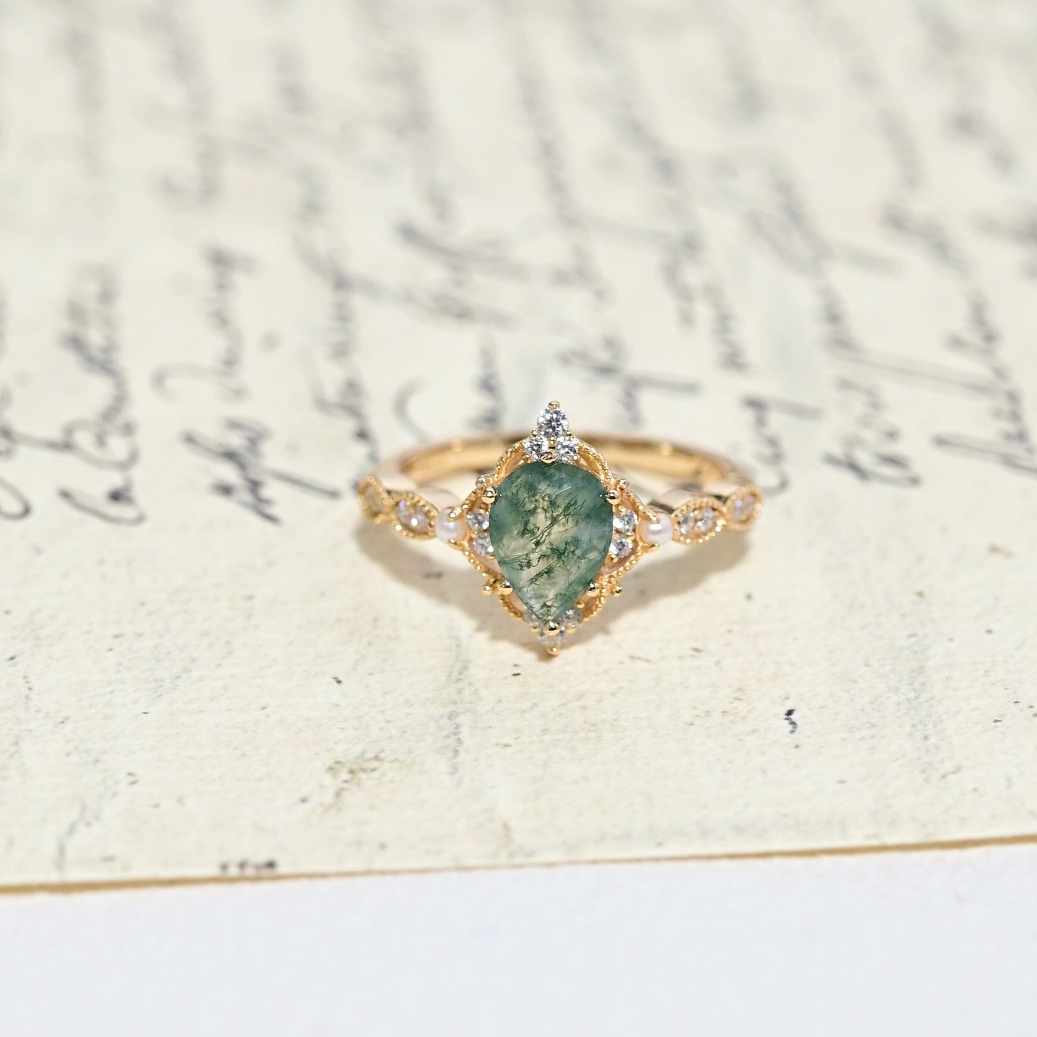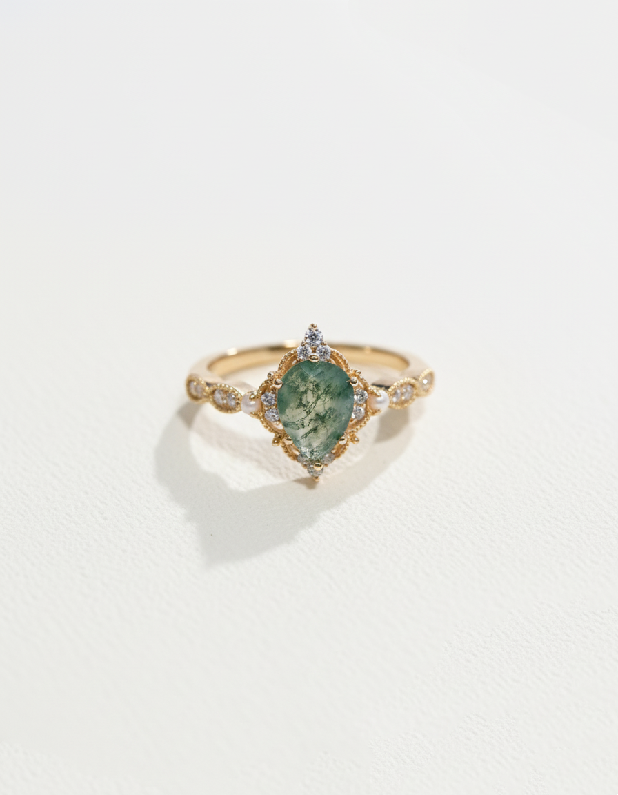 Inspired by vintage treasures and the poetry of nature, the Vintage Moss Agate Pearl Ring captures the elegance of a bygone era. The pear-cut moss agate resembles morning dew glistening on leaves, while soft pearls add a touch of purity and light. Together, they tell a story of calm elegance, timeless charm, and enduring grace — a piece made to be cherished across seasons.